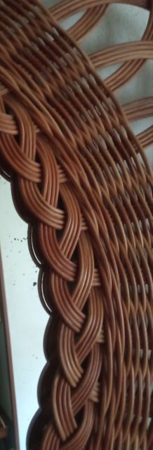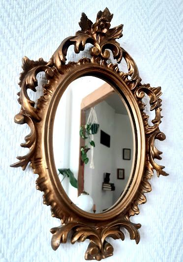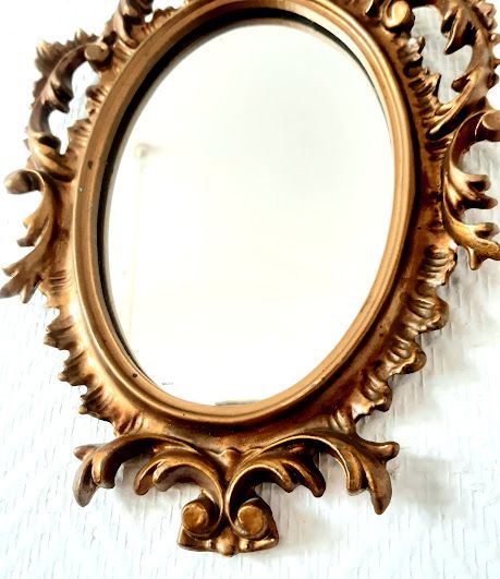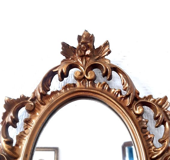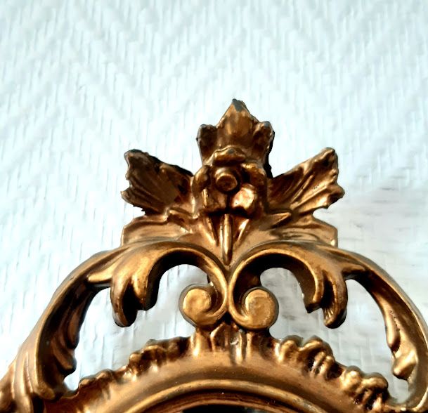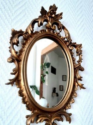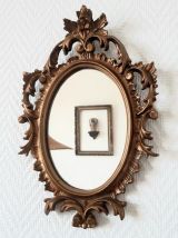 Petit miroir ovale en bois doré de style rocaille. Attache au dos afin de le suspendre. Petit format absolument charmant.