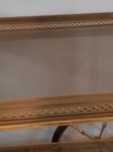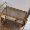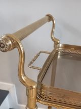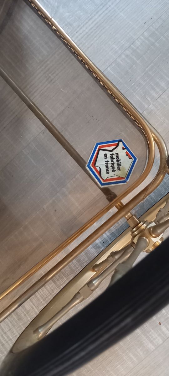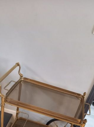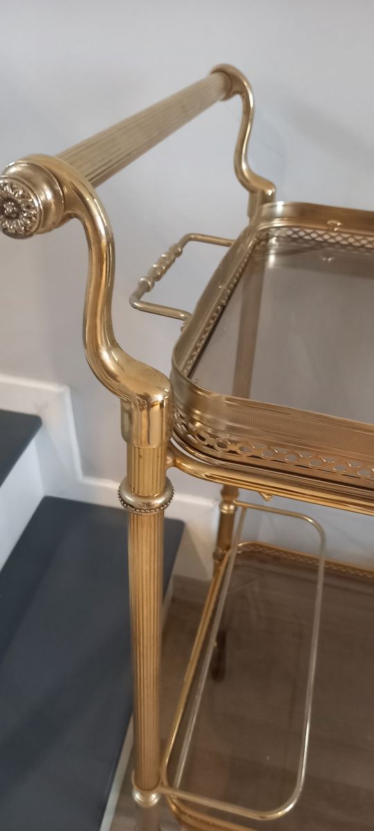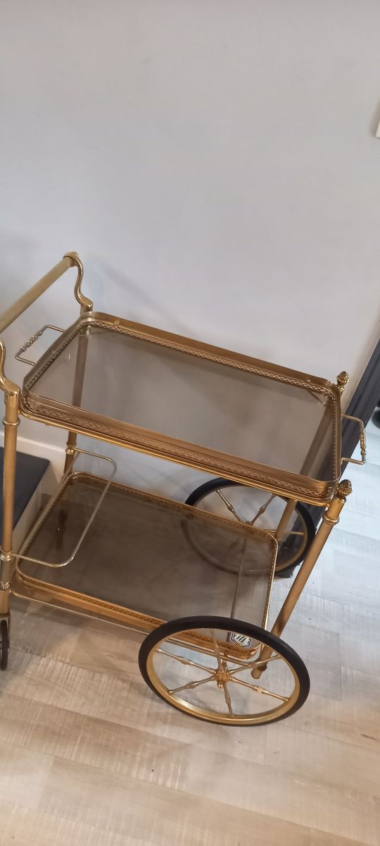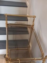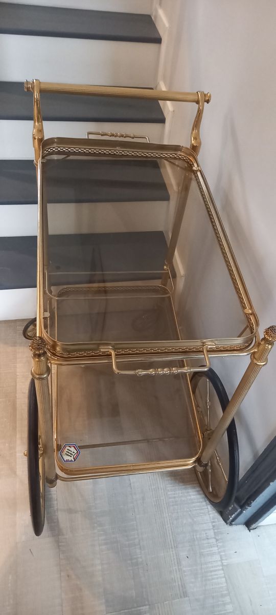 Magnifique Desserte Roulante laiton doré et verre achete à la Samaritaine Paris yca 33ans servie une fois fabrique en France étiquette encore visible les plateaux ne sont pas fixé on peut les enlevé afin de servir .les verres sont de couleur un peut foncé très bonne état