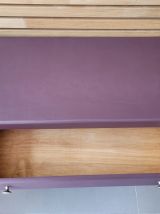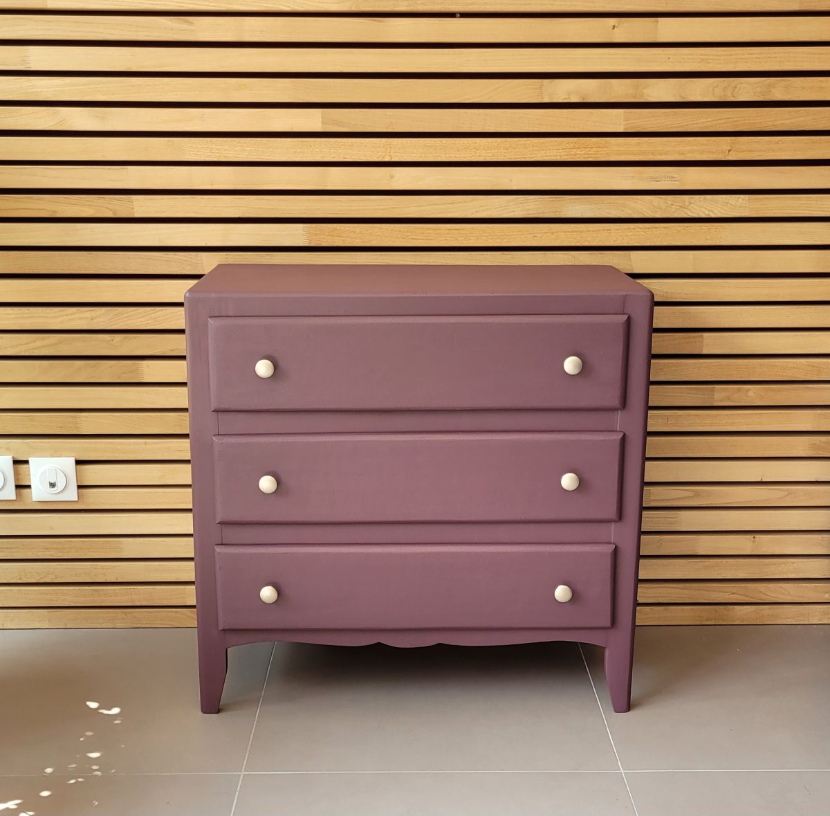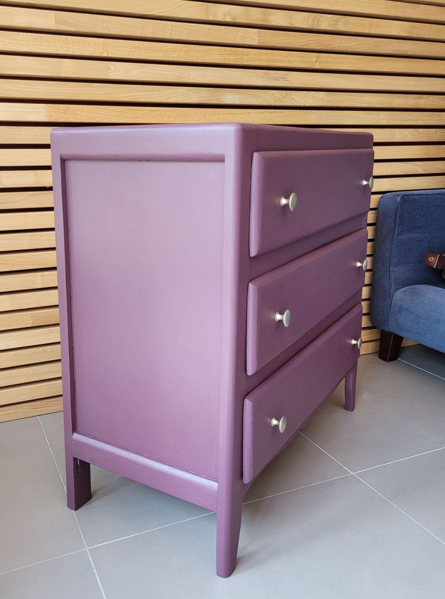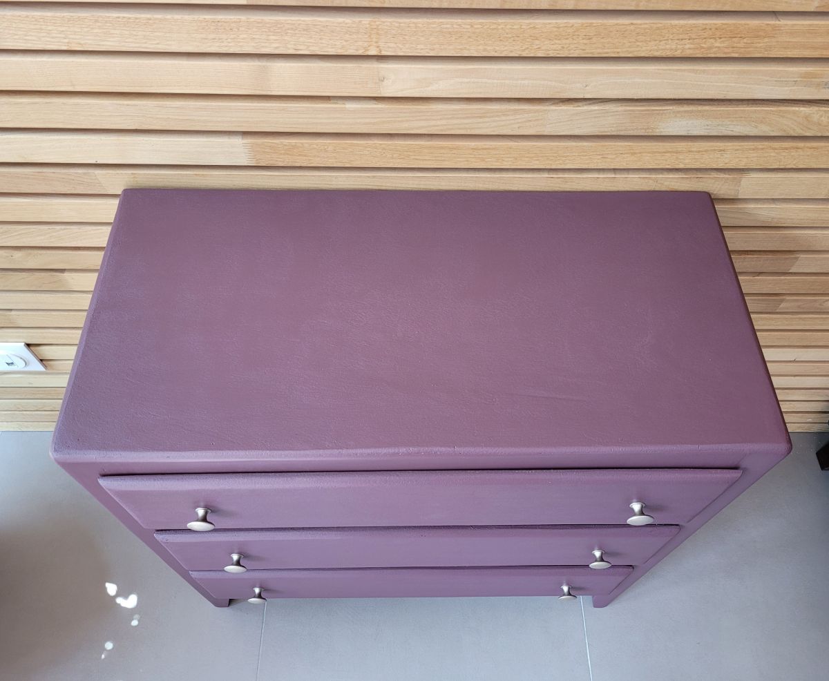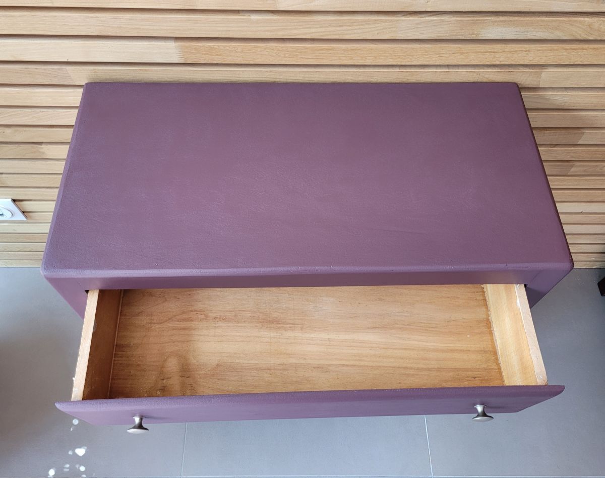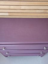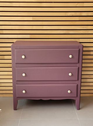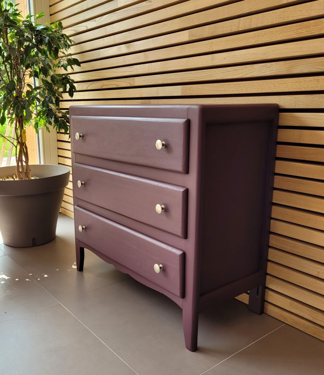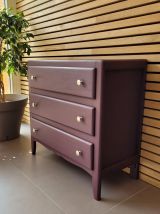 Commode parisienne vintage des années 60 en bois massif. Elle a été entièrement restaurée: nettoyée, poncée repeinte dans la nuance "aubergine" de chez 1825 peintures (satin velouté). La commode est en très bon état. Les boutons en aluminium sont d'origine. Le meuble est sain, stable et propre. Les tiroirs coulissent parfaitement. Livraison possible dans un rayon de 60 km contre dédommagement.