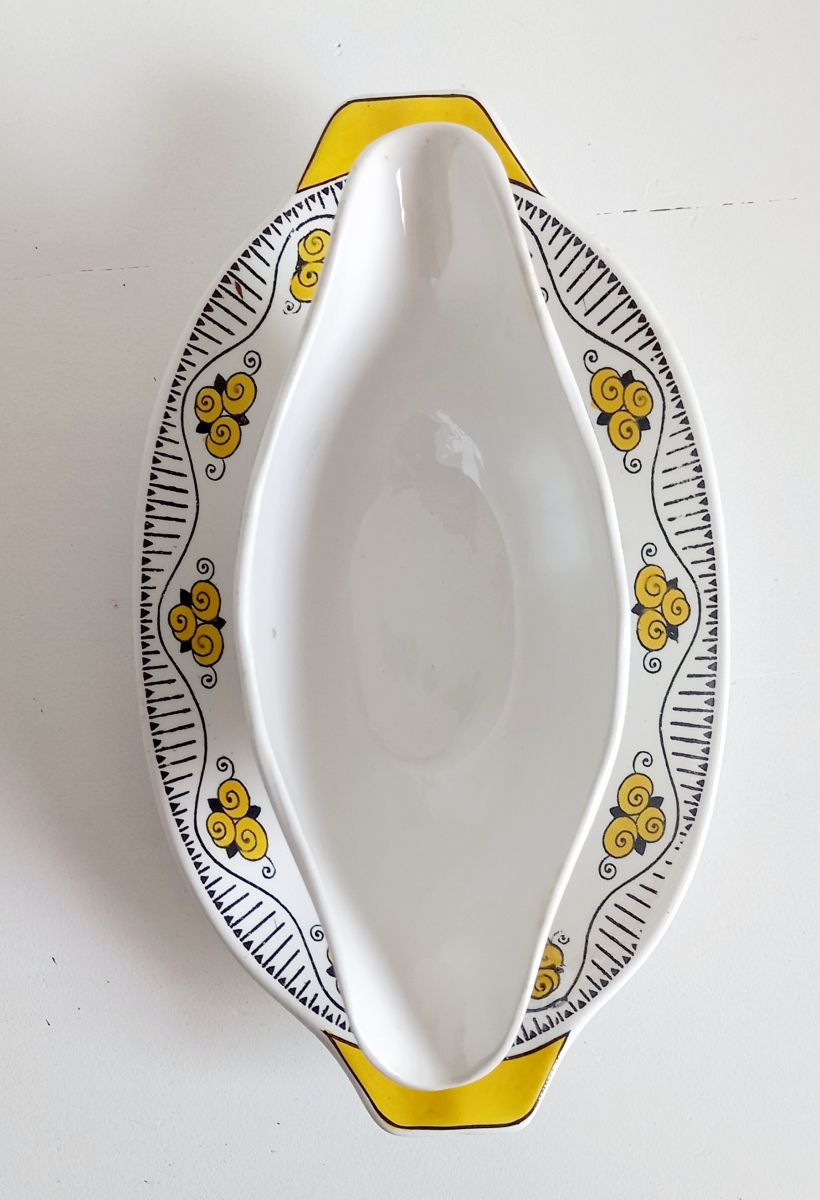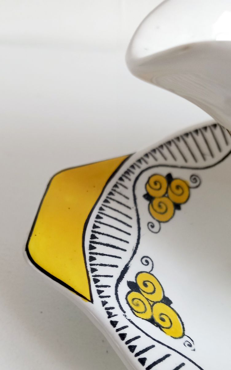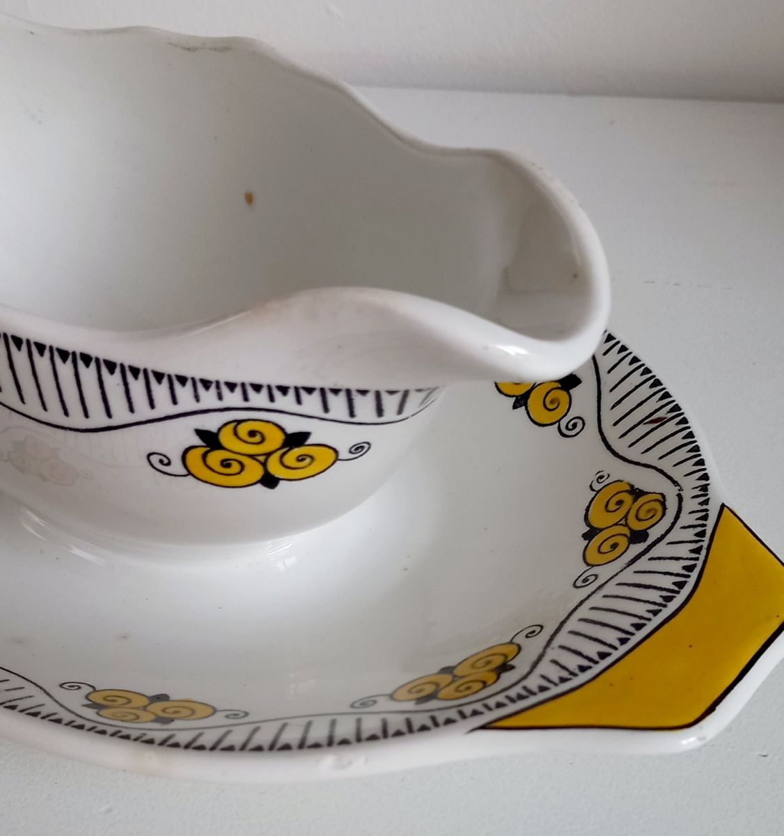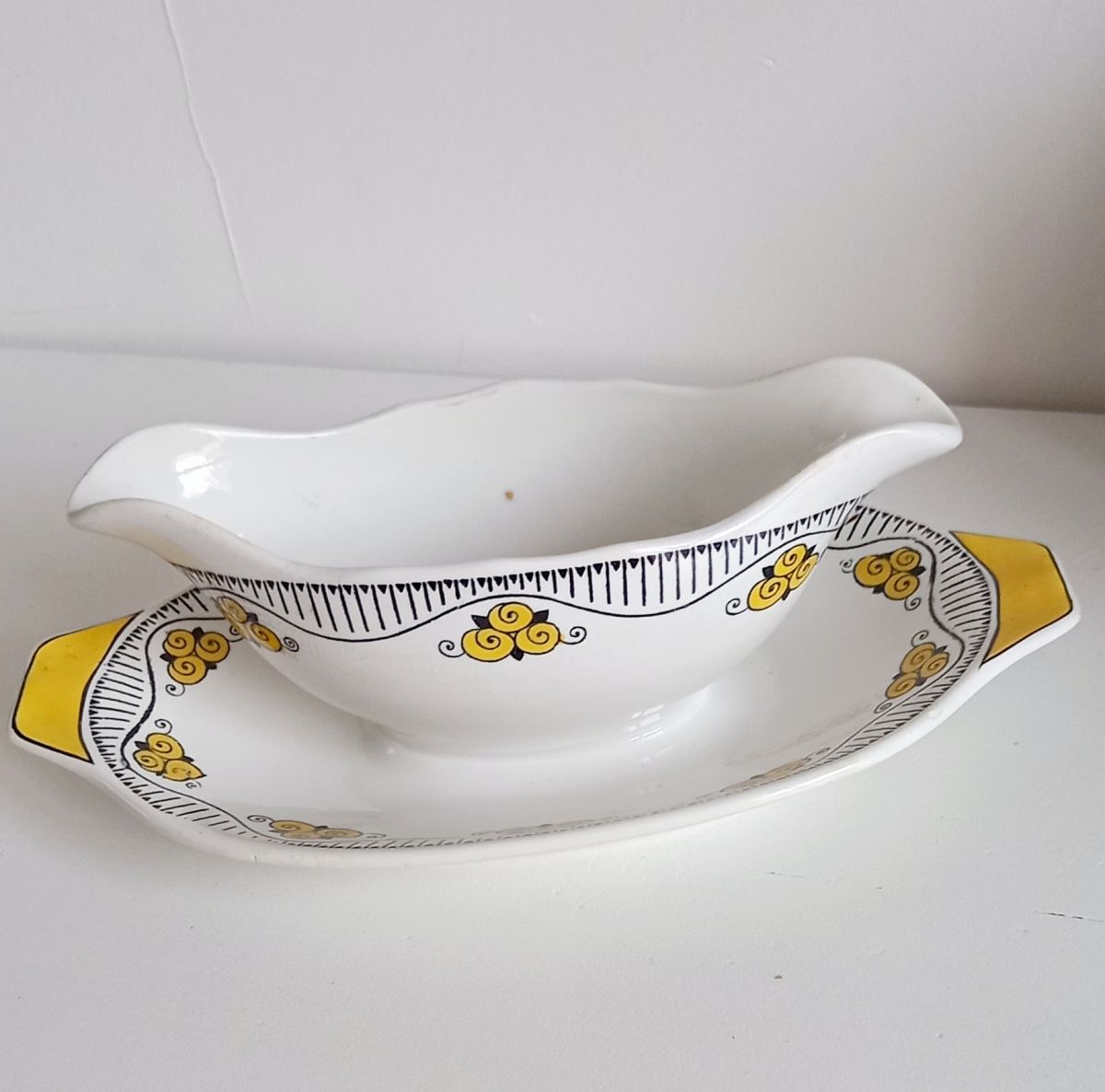 Saucière en céramique avec décor stylisé jaune et noir.