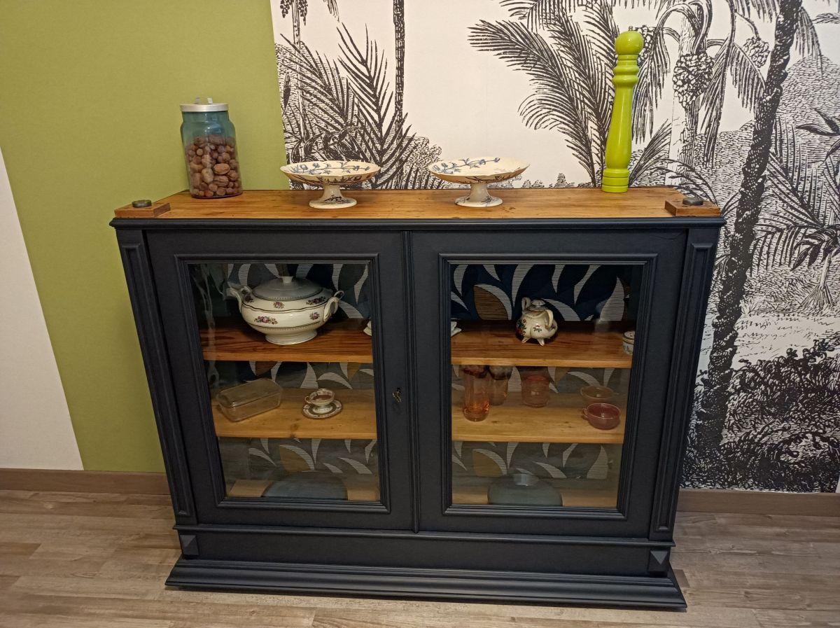 Haut de buffet double corps, retourné pour en faire un joli meuble vitrine. La planche de base du meuble est neuve et renforce la solidité d'origine.