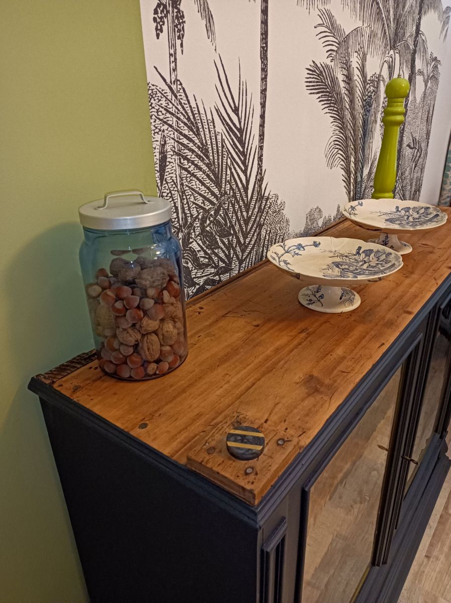 Comme le meuble est "retourné", les tourillons qui servaient à solidariser les deux parties du meuble ont été ornés de cabochons bleu nacré et doré et donne une touche singulière.