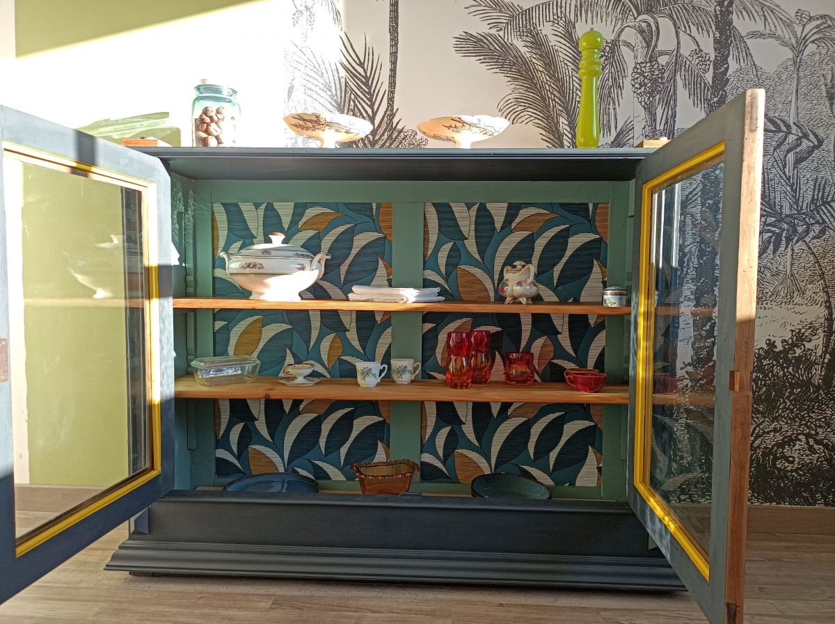 L'intérieur est peint en vert Saulaie et le fond tapissé d'un papier végétal graphique.