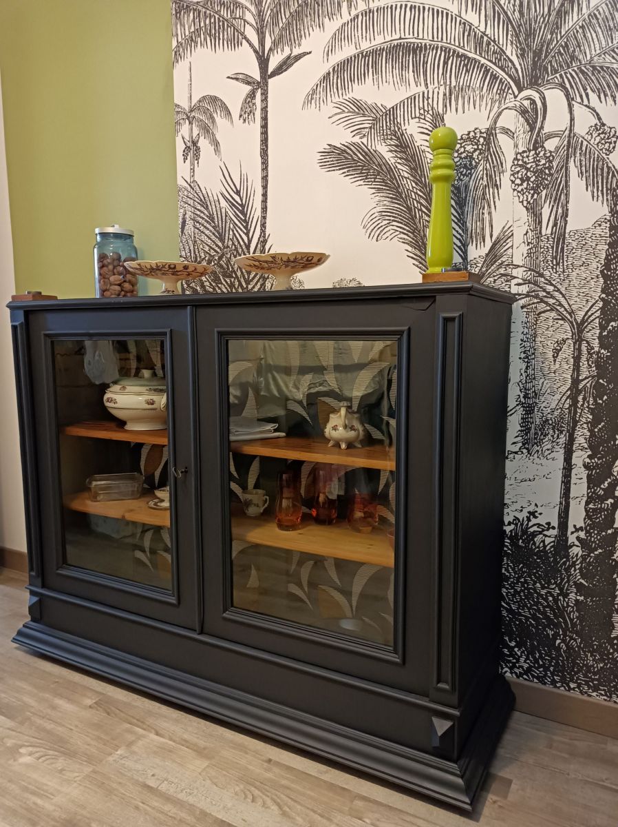 Le meuble est peint en anthracite Laggua, pour accentuer le coté chic et élégant déjà apporté par les moulures.
