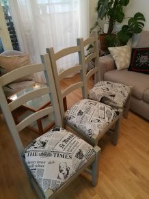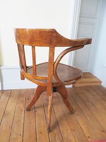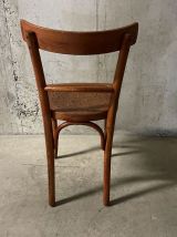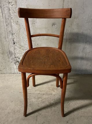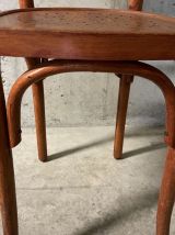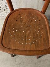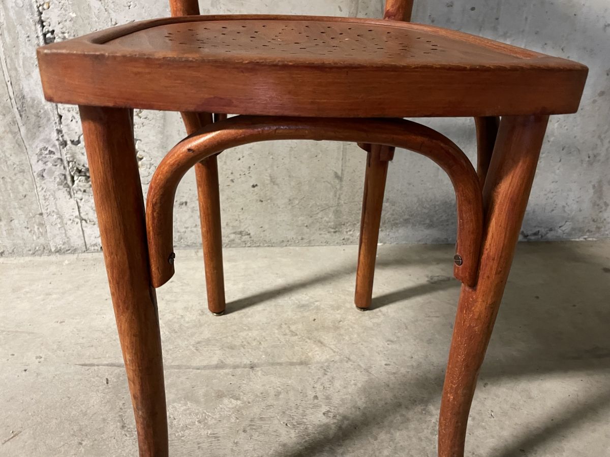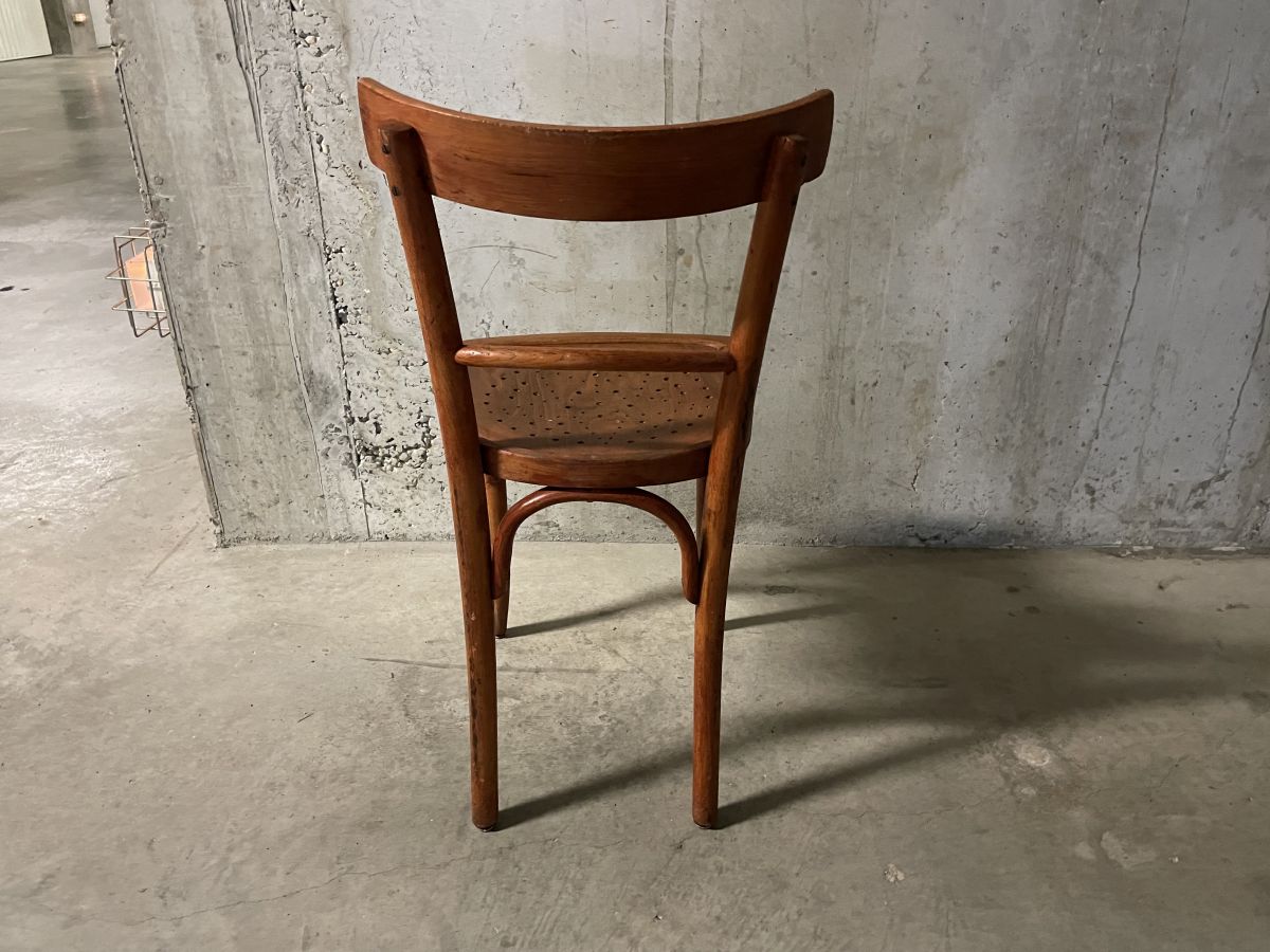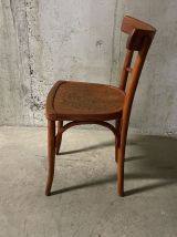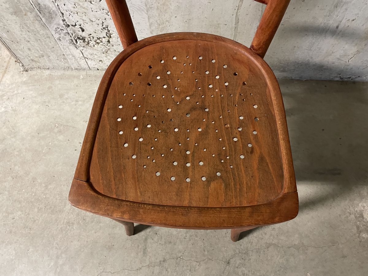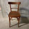 Chaise bistrot des années 60 en bois massif reverni, sublime patine miel, assise ajourée, hauteur 80cm, hauteur assise 48cm, assise 37x37cm, bon état.