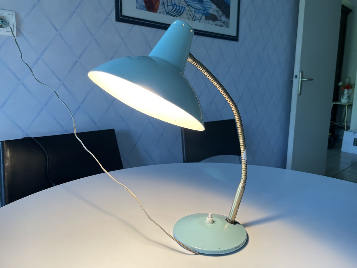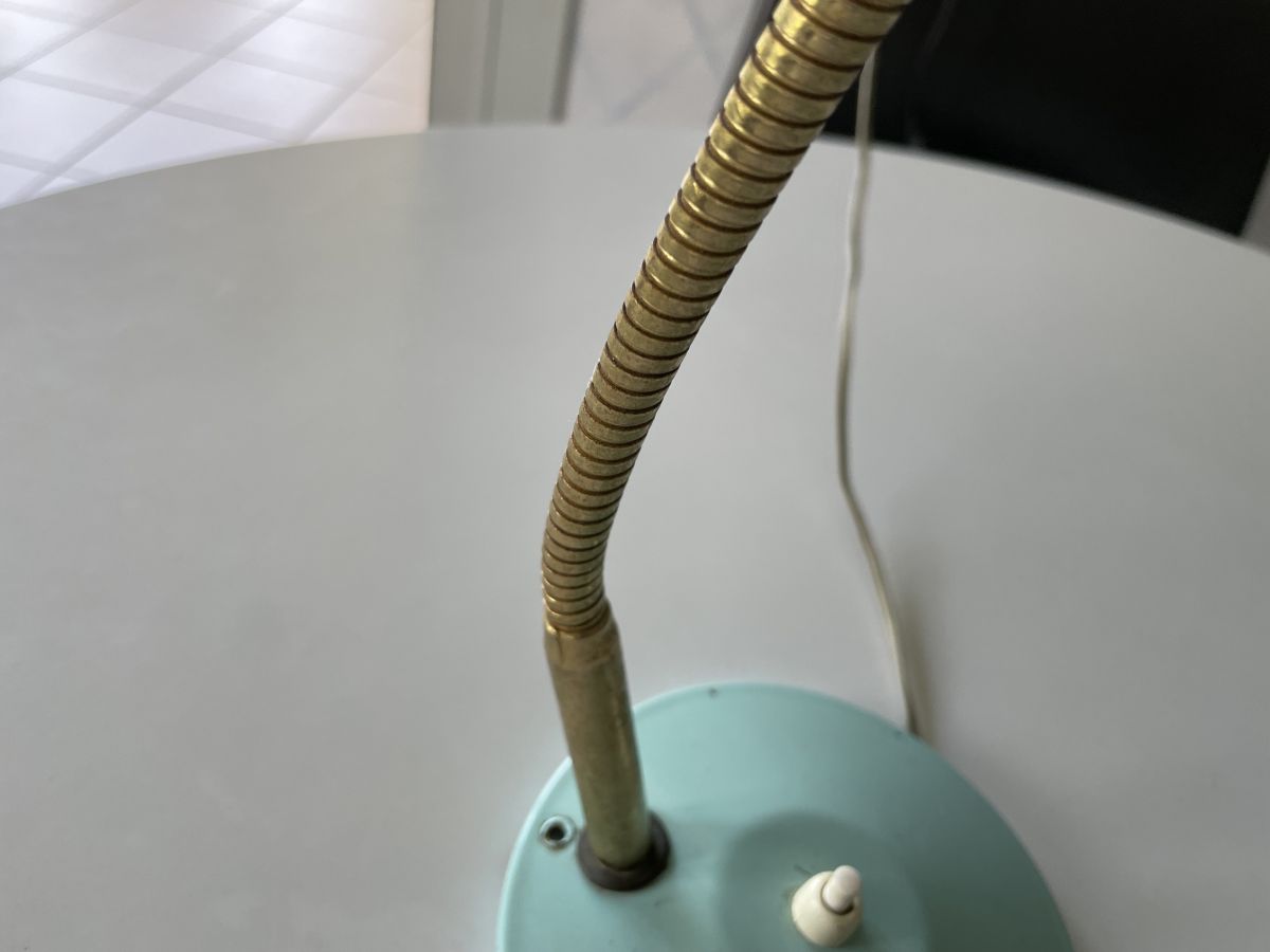 Lampe de bureau turquoise à poser des années 50, socle et abat-jour en métal, tige flexible réglable, en parfait état de marche, quelques traces d’usage, hauteur 35cm, diamètre abat-jour 17cm, largeur socle 13cm, bon état.