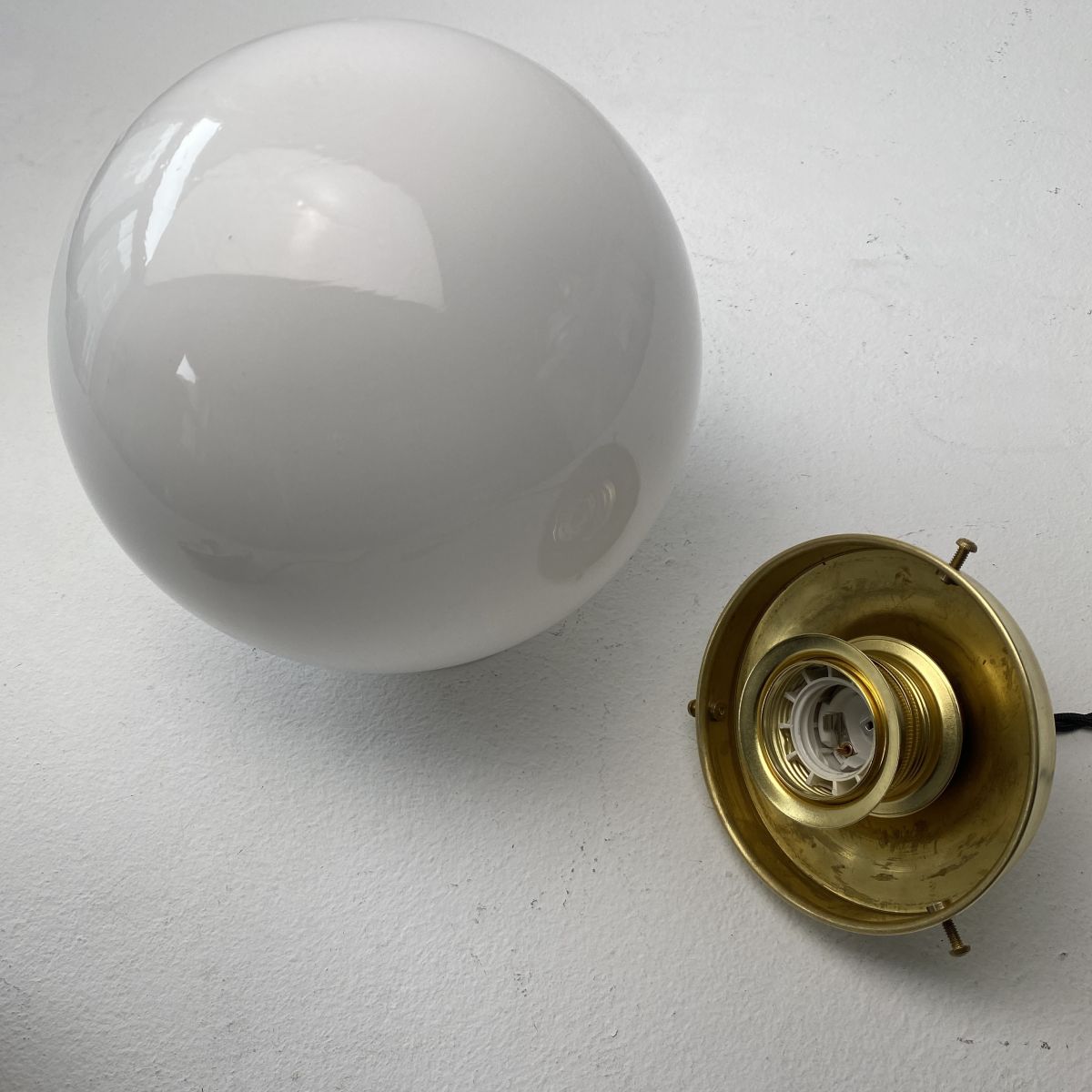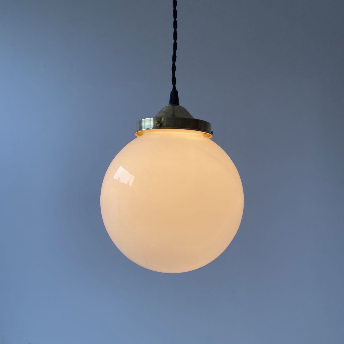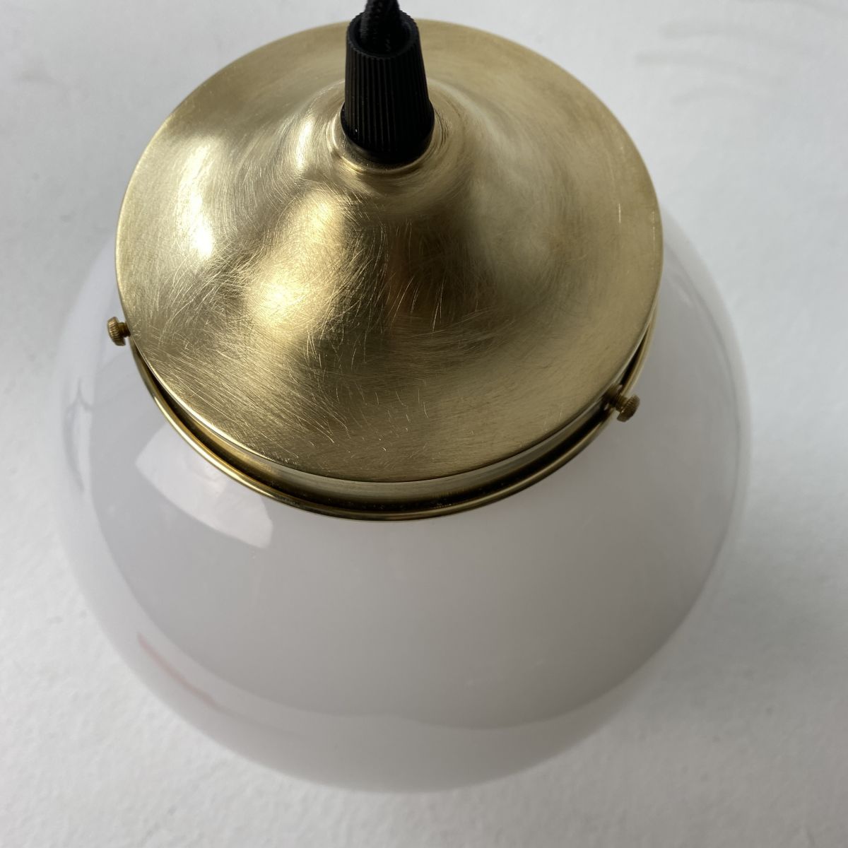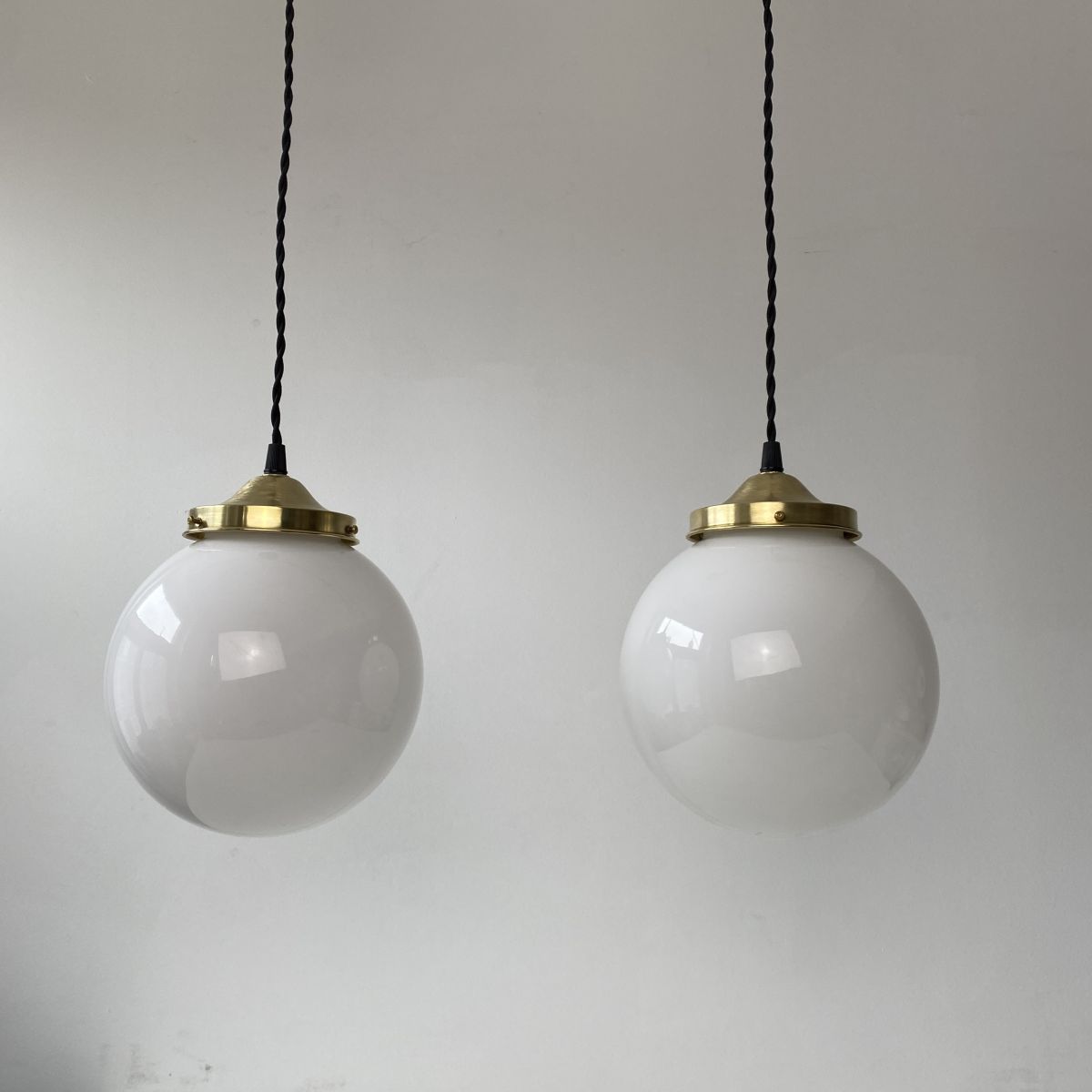 2 belles suspensions en opaline blanche des années 1950. Lumière tout en douceur. En très bel état.