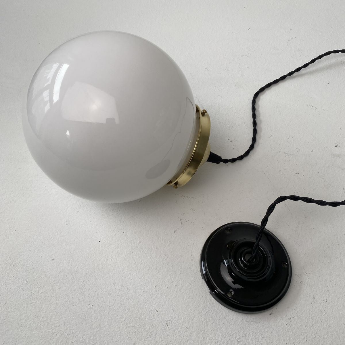 Electricité refaite à neuf avec fil noir en tissu tressé. Prête à brancher par domino. Douille à vis gros culot (ampoule E27). Rosace en porcelaine pour accroche au plafond.