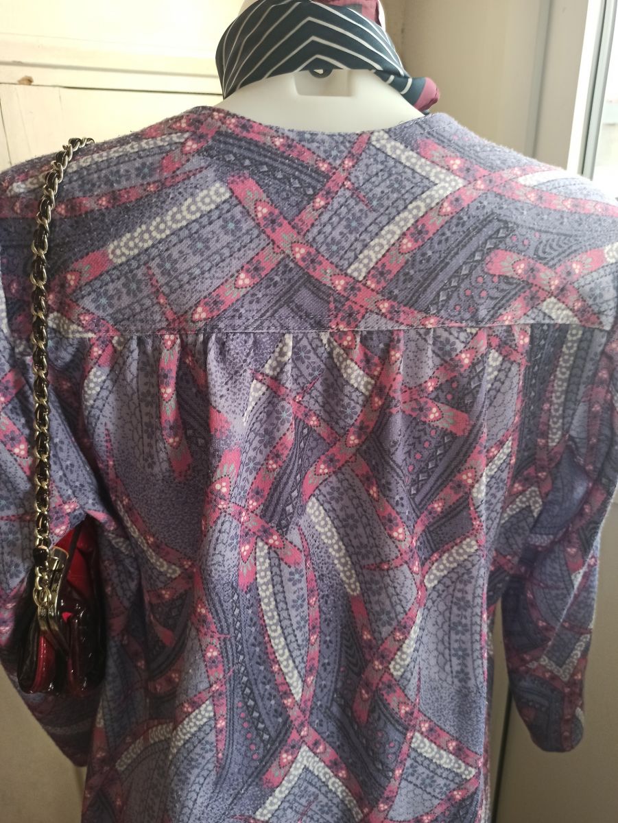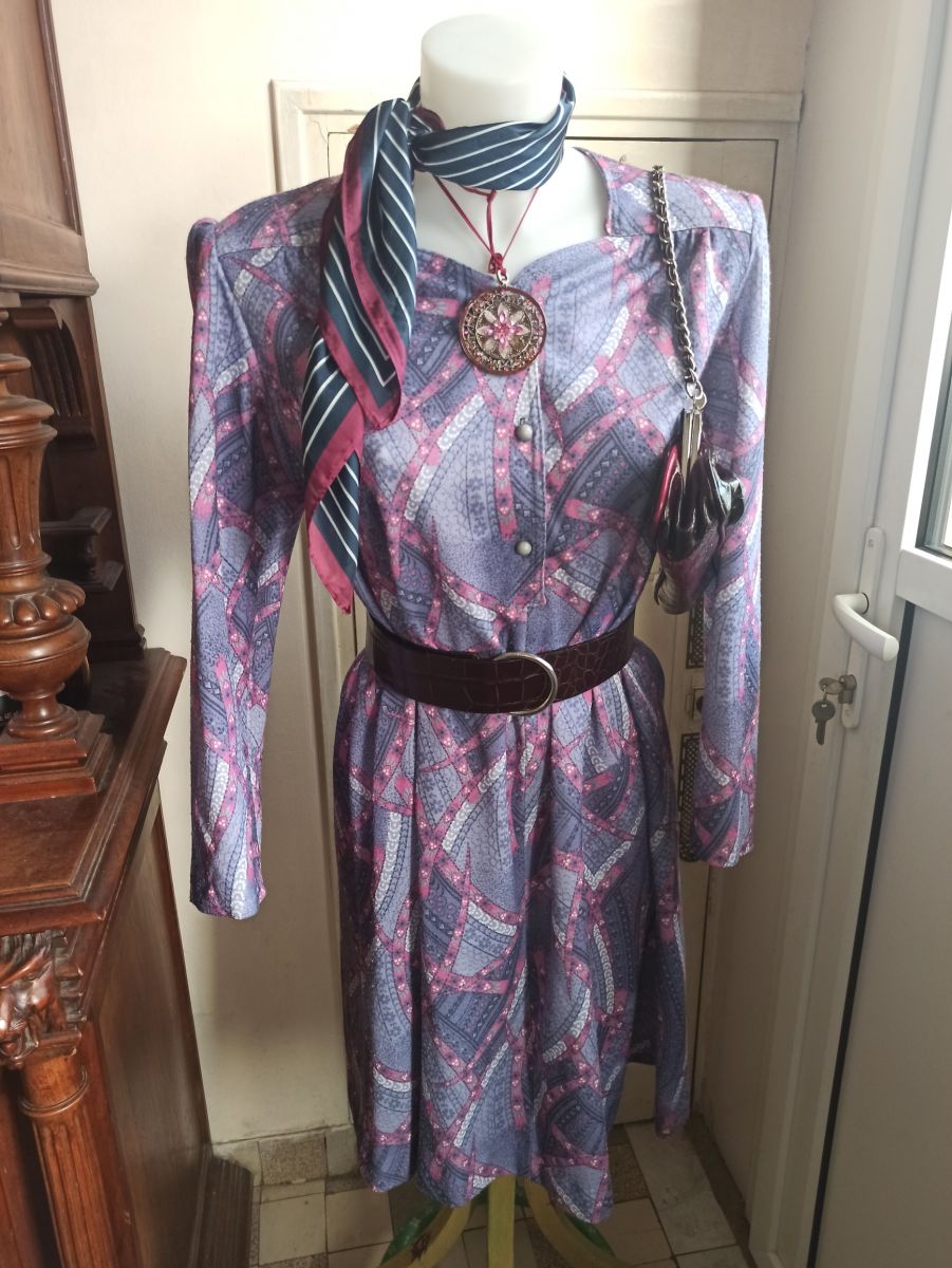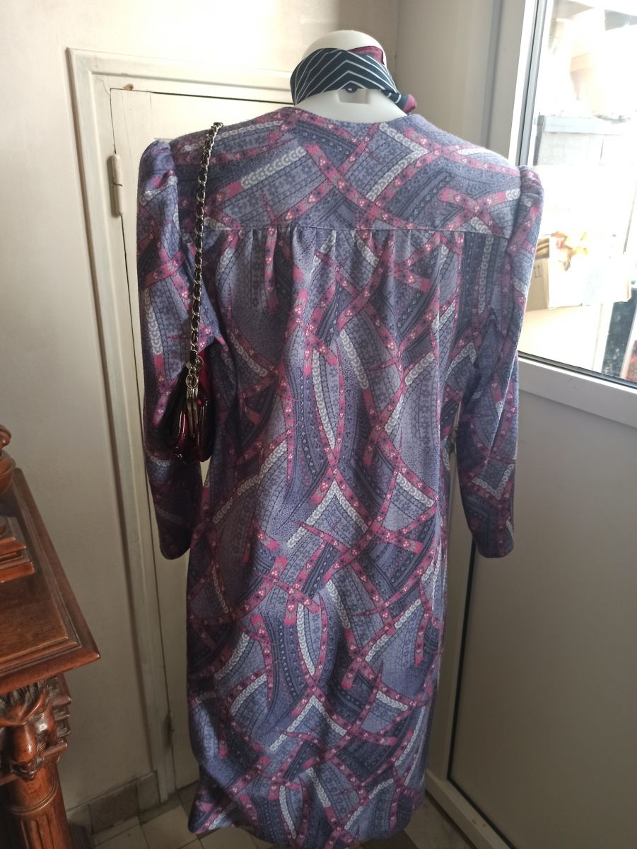 Robe d'hiver à manches longues et tissue épais, pas doublée. Col à petits boutons Motifs géométriques en lilas rose et mauve , éclectiques. Vintage années 80. Epaules marquées mais sans épaulettes. 100 % polyester. Mesures : aisselles 59 cm long 100 cm. Taille 46 voir 46/48.