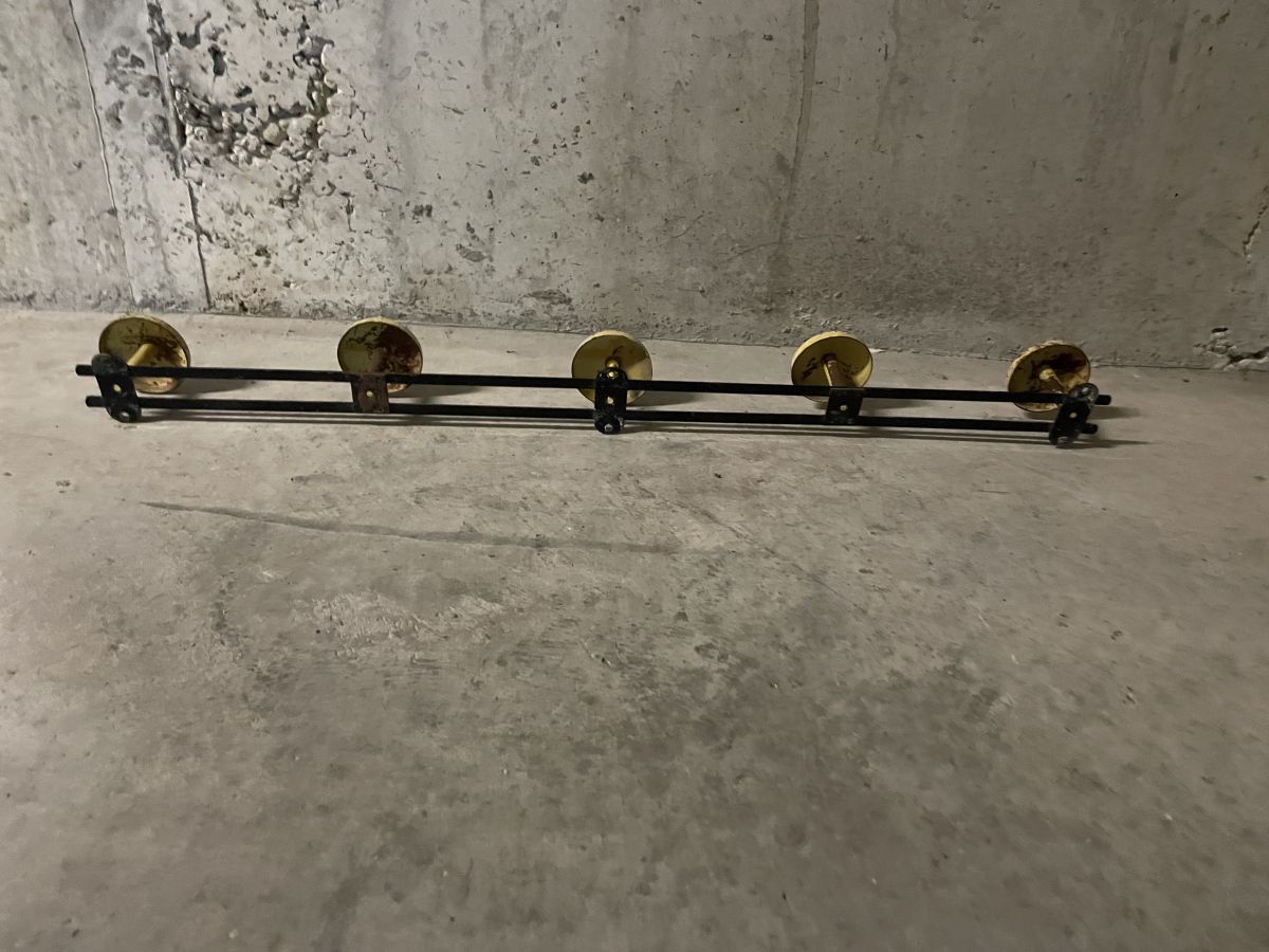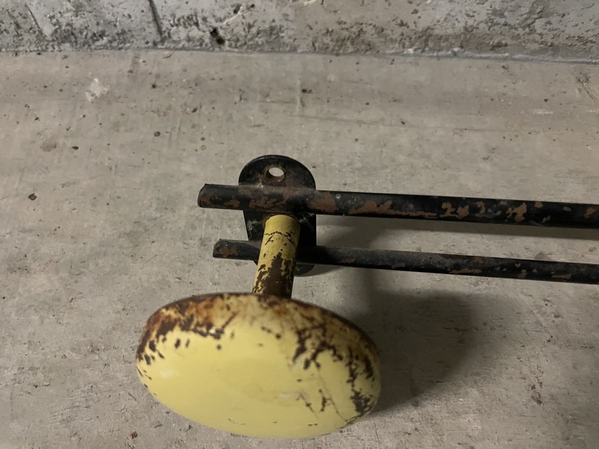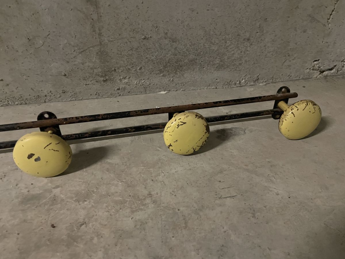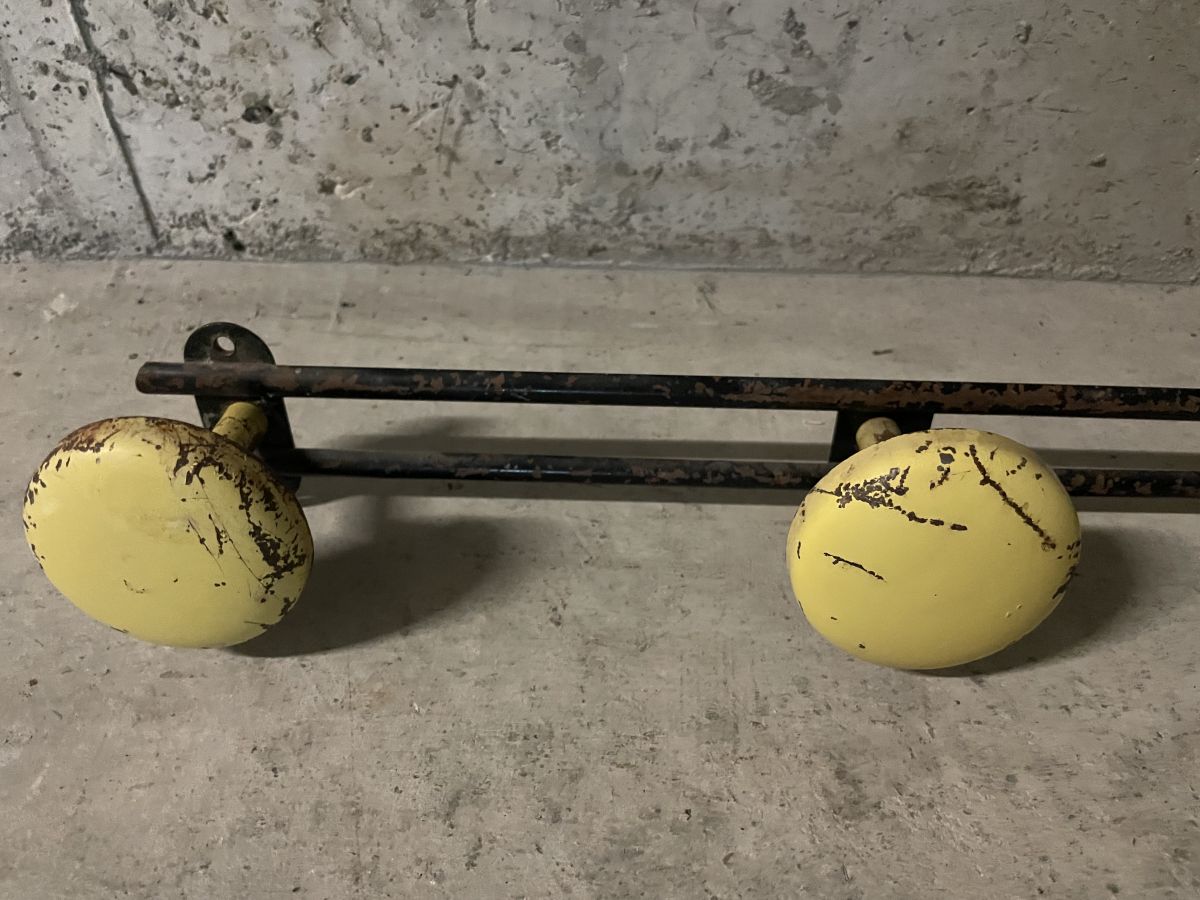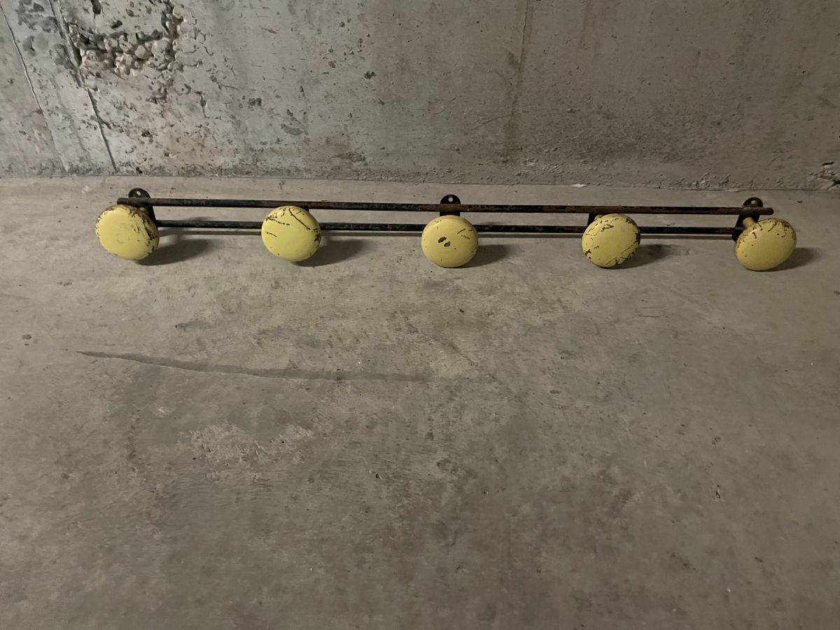Patère 5 boules jaune des années 50 en métal, quelques traces du temps lui donnant tout son charme, dimensions (cm): L.78xH.6xP.6, bon état.