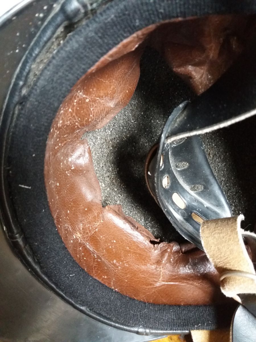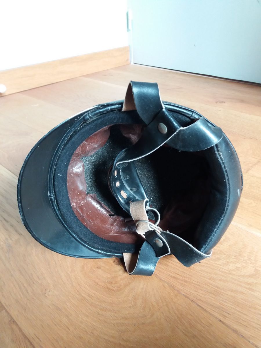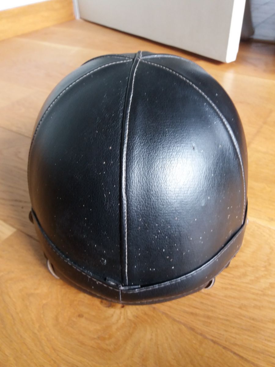Petite bombe d’équitation en cuir principalement, avec une visière et un protège menton en plastique, pour une déco sportive vintage. Elle a un look retro, mais je n’ai aucune idée de quand elle date, j’imagine qu’elle ne doit pas être toute jeune car la partie à l’intérieur (un cuir fin il me semble) est complètement sèche et tombe en morceaux. Pour le reste, l’état est correct, les coutures sont intactes mais elle présente de nombreuses petites taches (que je n’ai pas réussi à nettoyer), quelques marques d’usure sur le cuir et des aspérités sur le bord de la visière. Le cuir de la lanière d’attache est en bon état, mais un peu raide. Elle est tapissée à l’intérieur d’une mousse synthétique. Elle mesure 24 cm de la visière jusqu’au protège-nuque, 19 cm d’un côté à l’autre, et environ 17 cm de « hauteur »