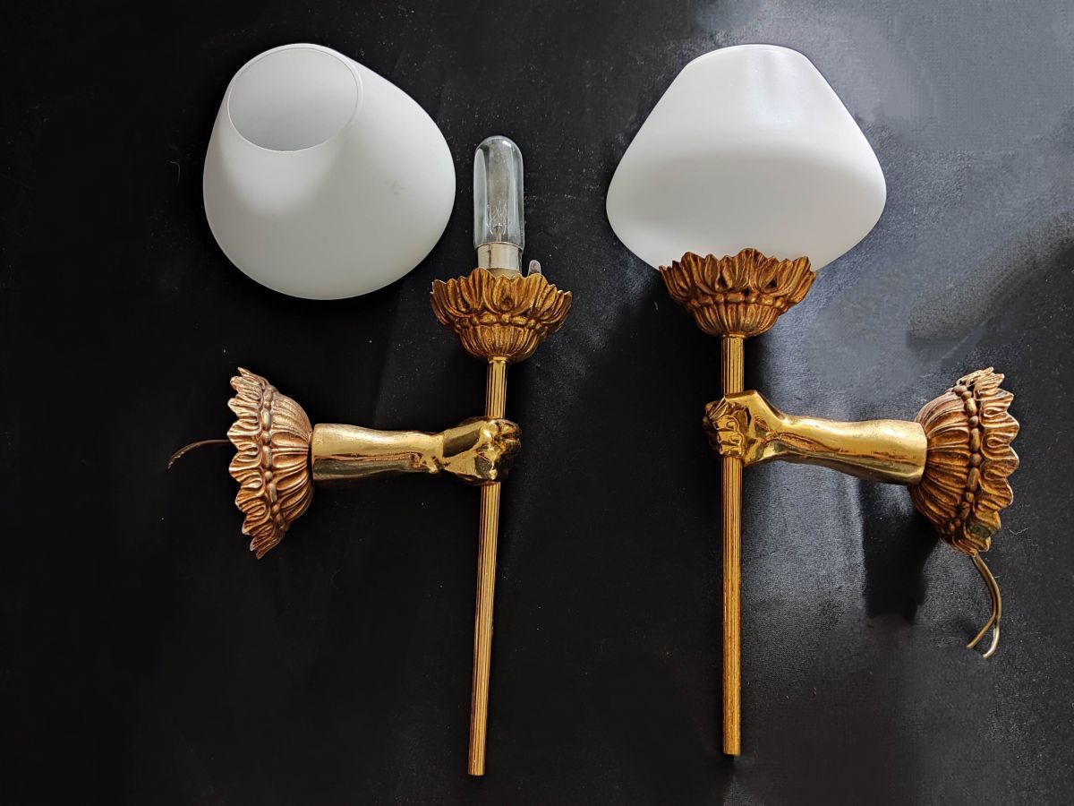 lot de 2 appliques mains flambeaux en laiton avec globes en opaline
