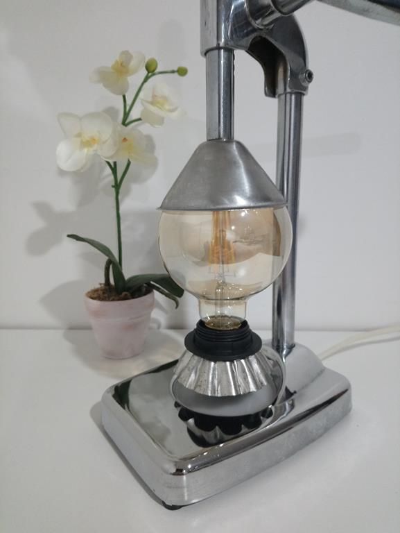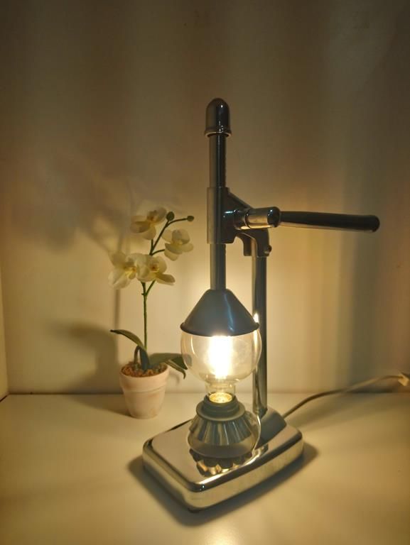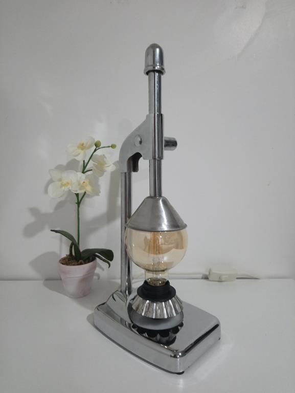 Presse-agrumes manuel en acier inox transformé en lampe à poser.