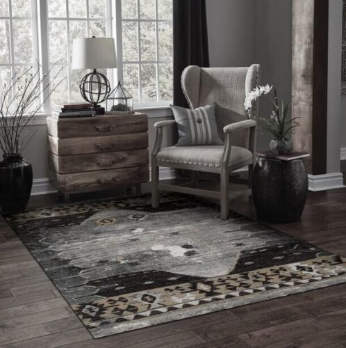 Un tapis doux et moderne simple de couleurs gris foncé et de motifs. Le tapis est épais et résistant.