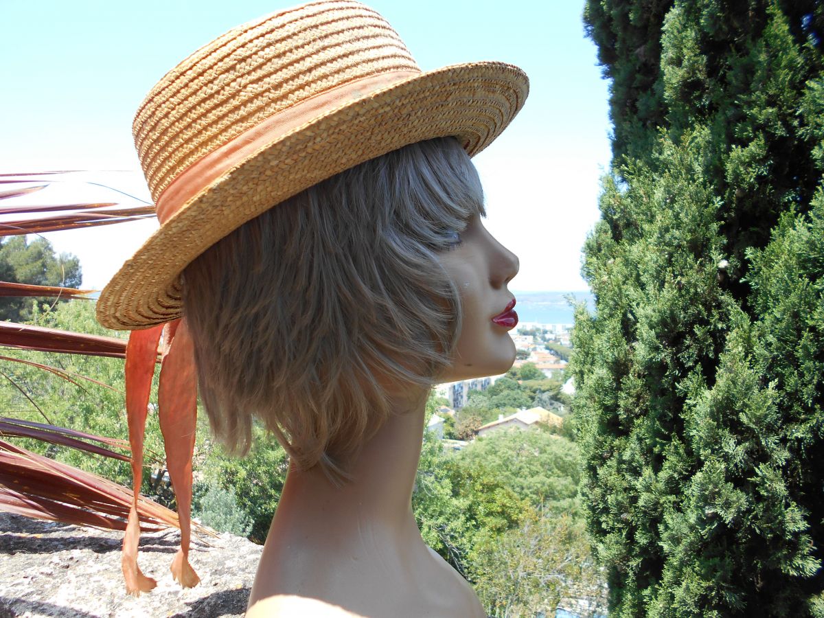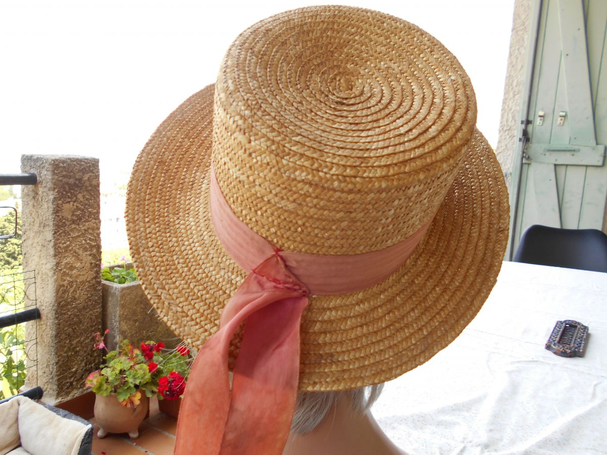 CHAPEAU ANCIEN VINTAGE PAILLE RUBAN VIEUX ROSE T 56-57