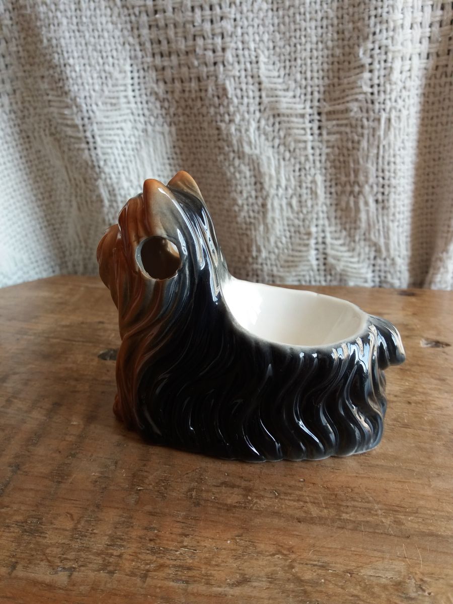 Adorable et très original coquetier en céramique en forme de chien, un Yorkshire. Il est percé de deux trous sur les côtés pour y présenter une cuillère. Le coquetier est plutôt grand (diamètre interne 5 cm), ce qui permet, il me semble, d’y mettre même un œuf de cane ou d’oie. J’imagine qu’il doit dater des années 70 mais sans certitude. Il est en très bel état, ni fêle, ni éclat, peut-être juste un tout petit manque de moins d’un mm² sur le cou, mais je pense même que c’est d’origine. Il mesure 9,5 cm de longueur, 7 cm de largeur, 8 cm de hauteur.