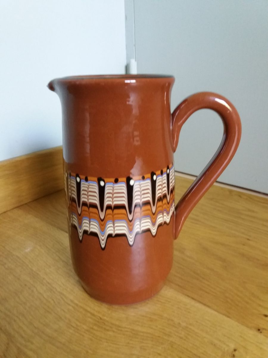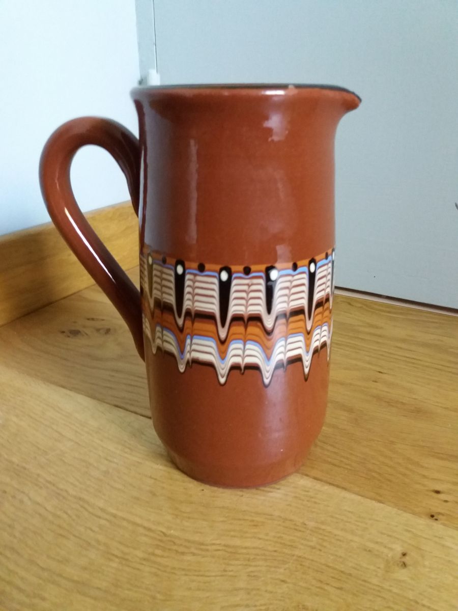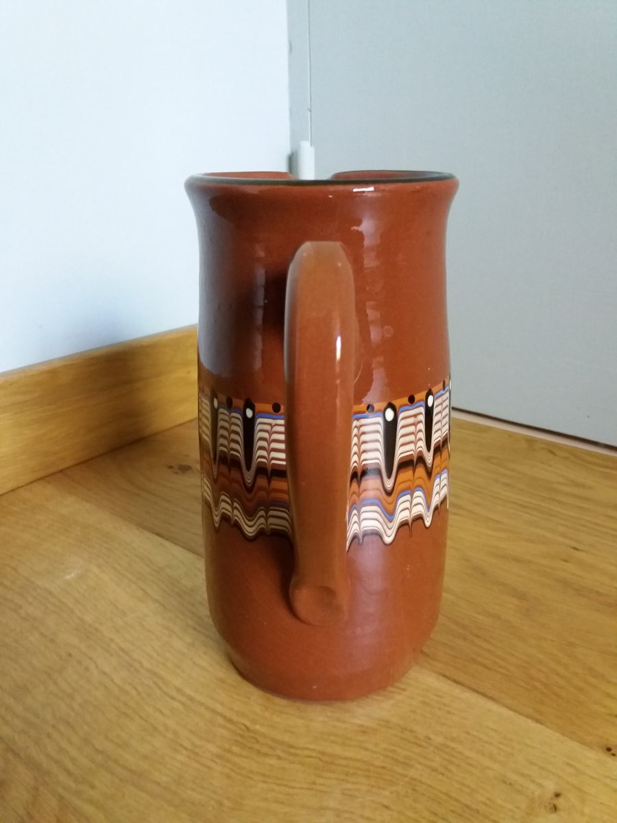 Très beau pichet en céramique émaillée de couleur chocolat au lait avec un décor finement exécuté, composé de coulures de différentes couleurs (écru, caramel, noir et bleu). Ces motifs sont typiques de la céramique de Troyen (parfois écrit Troyan, Troyon ou Trojan), une région des Balkans (Bulgarie aujourd’hui). Ces motifs différent légèrement selon l’artisan qui les a réalisés, car chacun avait son propre motif qui faisait office de signature.
