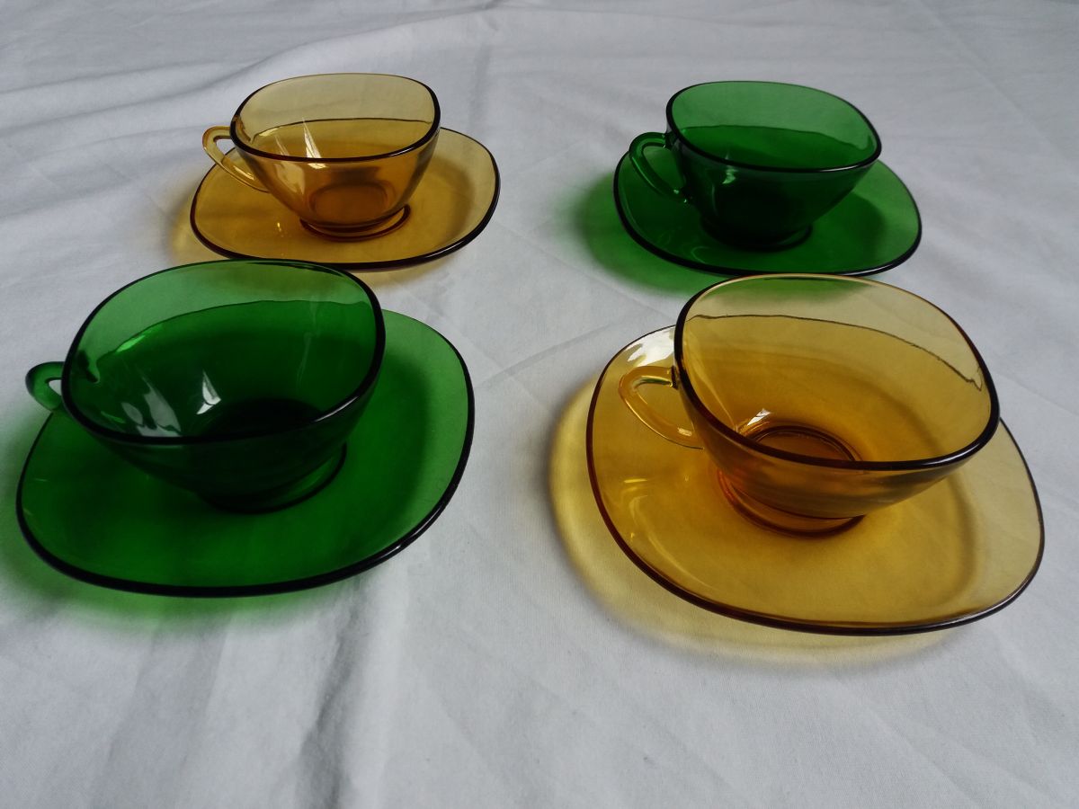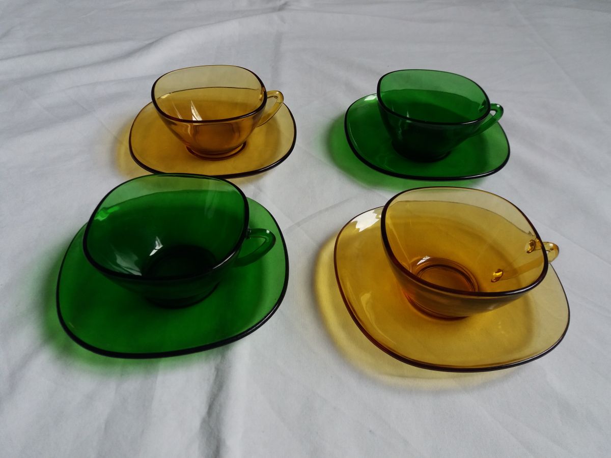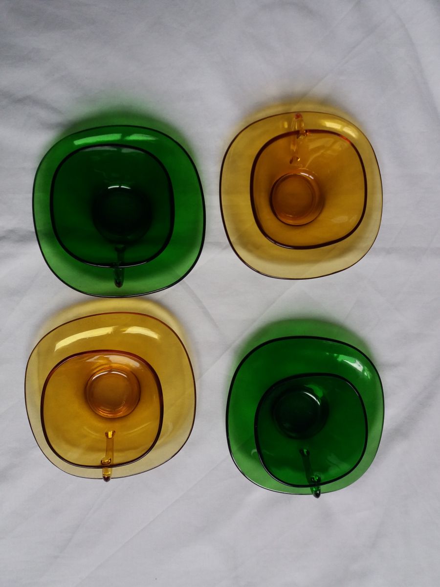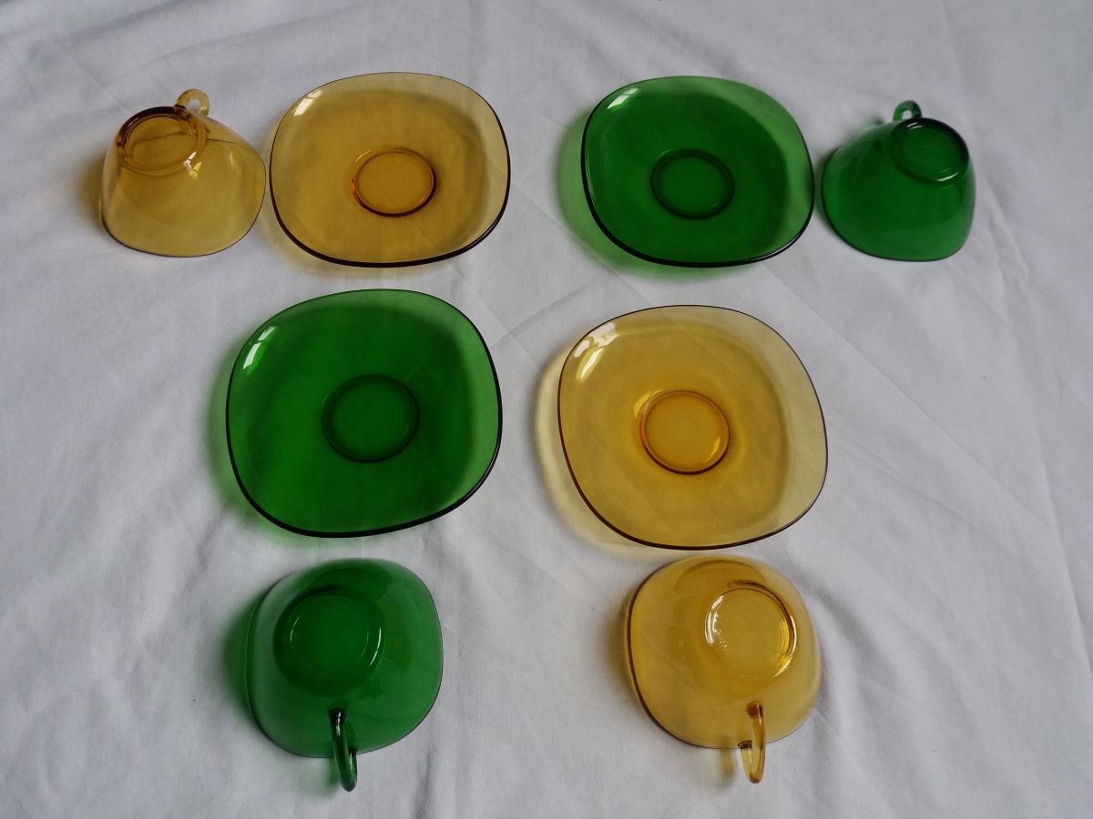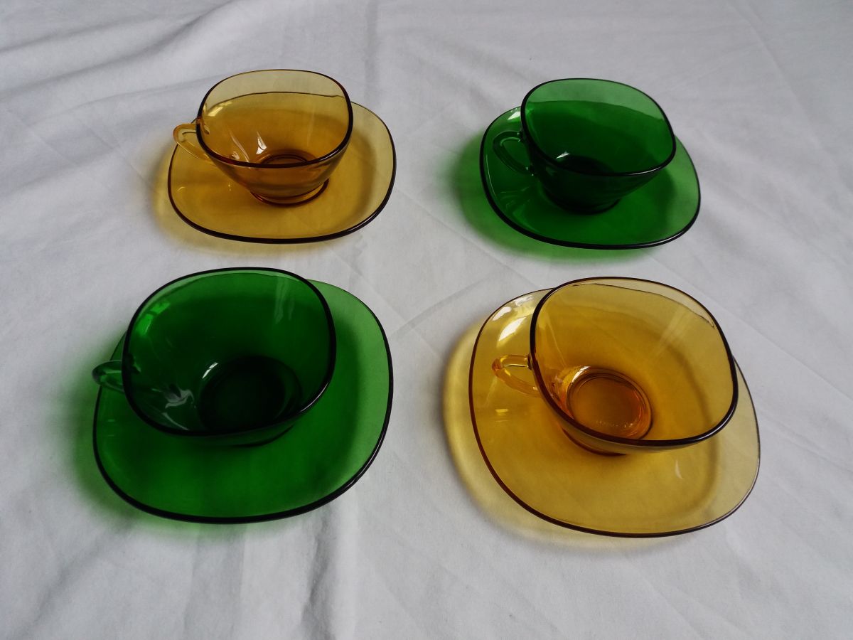 Ce joli assortiment composé de 4 tasses et 4 soucoupes en verre jaune ambré et vert mettra du peps sur votre table. Ces différents éléments de la marque Vereco, fabriqués en France (estampille dessous) dans les années 60 ou 70 étaient alors vendus en ensemble monochrome, mais assortir aujourd’hui les différentes couleurs est vraiment du plus bel effet. Tous ces éléments sont en bon état général, ni fêle, ni éclat, mais ne cachent pas leur âge et les traces d’usage qui vont avec : petites marques et rayures, pas trop visibles mais relativement nombreuses. Les tasses mesurent 4, 5 cm de hauteur pour 9 cm de côté (10, 5 avec l’anse), les soucoupes mesurent 13,5 cm de côté.