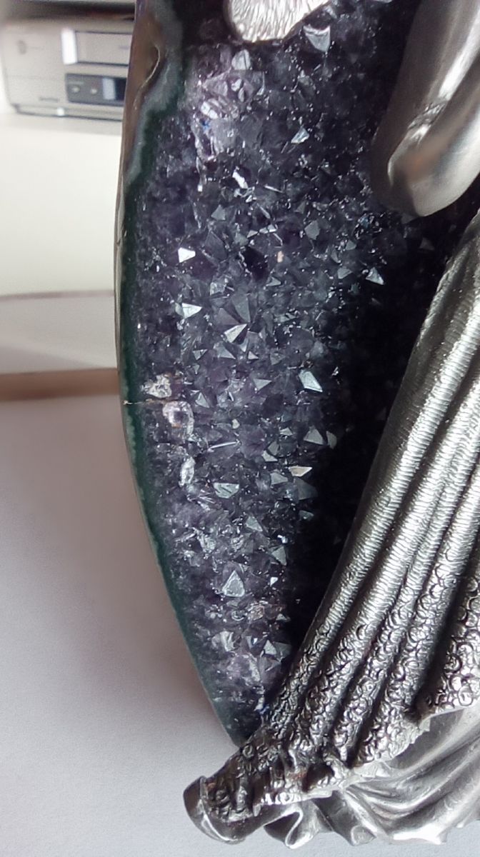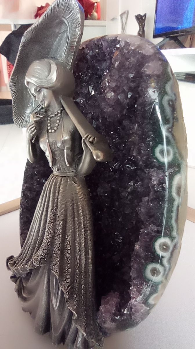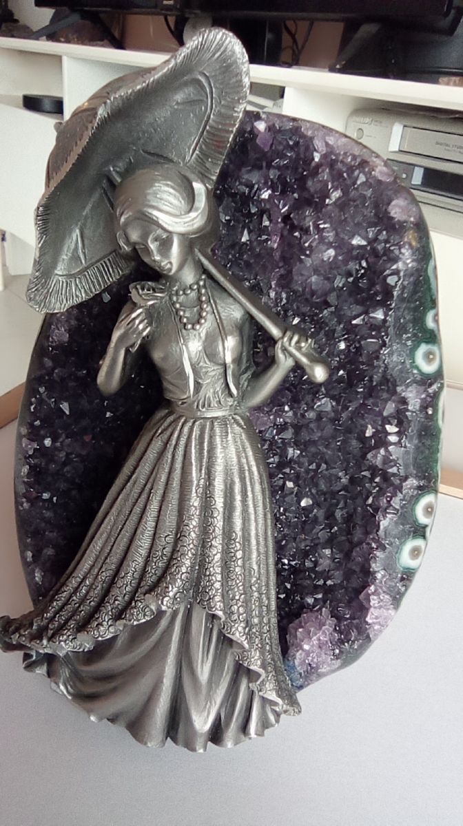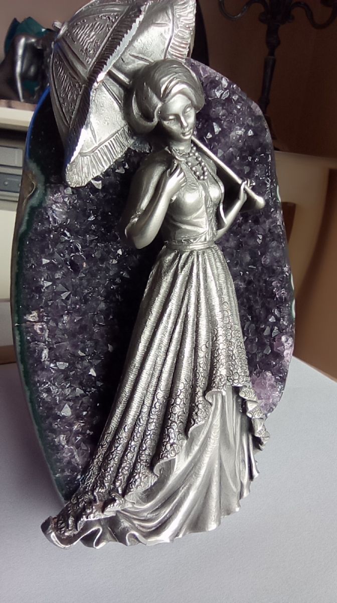 C'est Noël, prix baisse ! Un objet unique, une pièce de toute beauté alliant une superbe Améthyste druze, un florilège de scintillement allant d'un violet très clair à un violet très intense, brillante de mille feux. Dessus, une figurine de la célèbre maison des Étains du Prince, une teneur en étain de plus de 95%, retravaillée à la main par un descendant des créateurs de cette maison familiale créée par le couple Bachet ainsi que par mes soins car j'ai cette figurine depuis 20 ans. Vous trouverez sa signature juste en dessous de la robe sur l'étain. D'une finesse inégalable, d'un réalisme dans les moindres détails, on ne sait qui met en valeur qui ? L'améthyste ou la figurine dans le style Belle Époque. L'améthyste mesure 17cm de haut, 11cm de large et 7cm d'épaisseur. L'étain est d'une hauteur de 16,5cm, largeur de 9cm et épaisse d'un peu plus de 1,2cm. Beaucoup d'autres photos sur demande. Une occasion rare de vous offrir ou offrir à un Être cher une pièce unique, peut être pour une personne unique ? de toute beauté. N'hésitez pas à regarder sur le net uniquement le prix d'une améthyste similaire. N'hésitez pas agrandir les photos, beaucoup d'autres sur demande ainsi que mes autres annonces. Les éventuels frais de douane sont à la charge de l'acheteur. Je réponds à toutes les questions