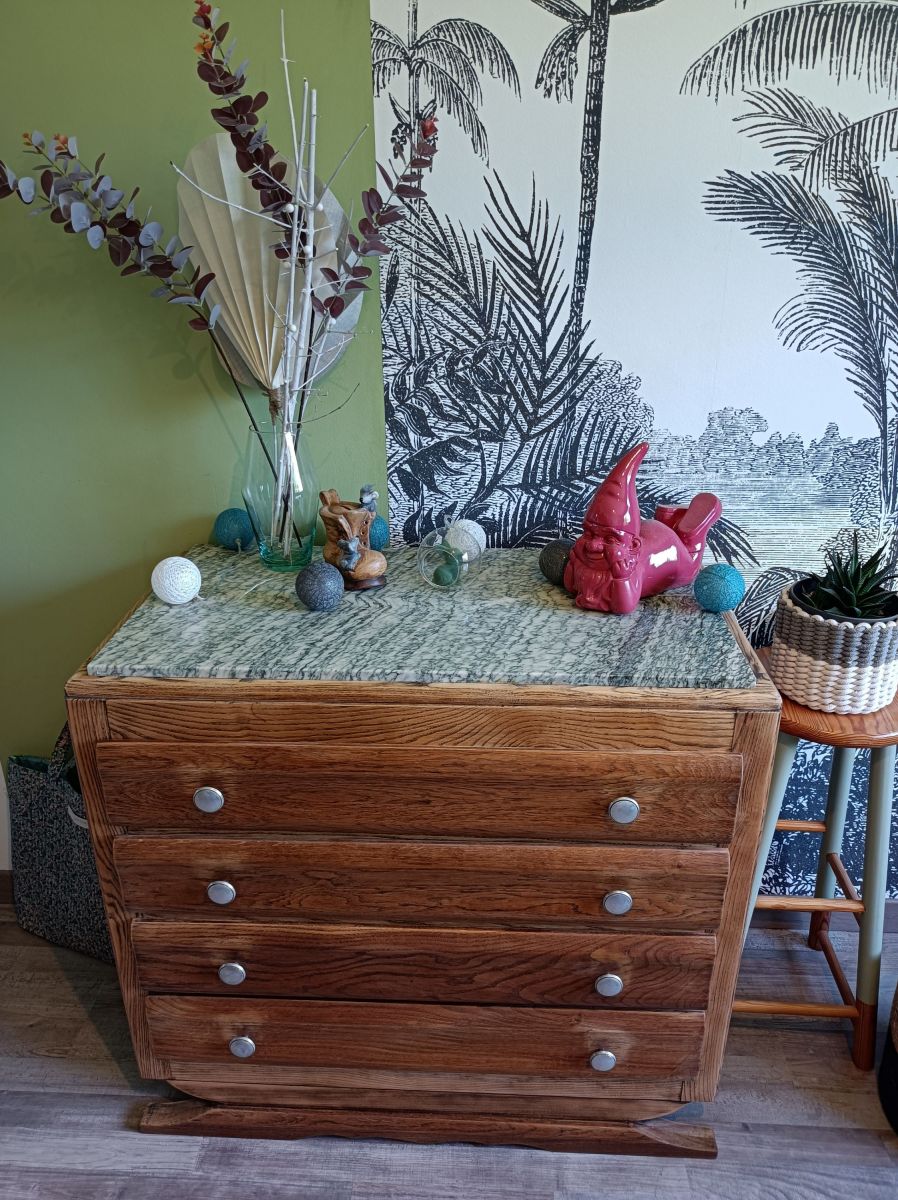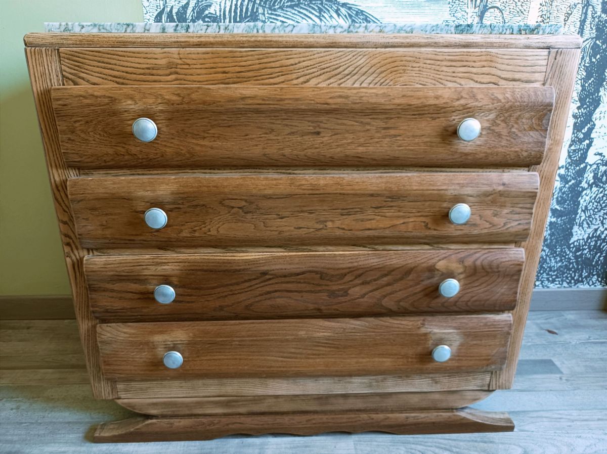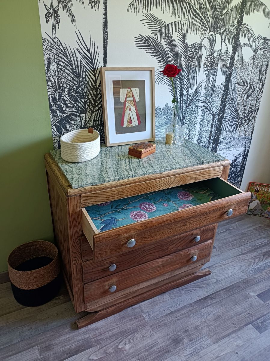 La commode a été restaurée et poncée pour qu’elle retrouve sa teinte naturelle et une belle patine. Le bois est protégé par une cire liquide et apporte de la douceur au toucher.