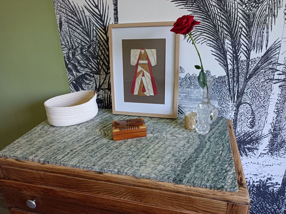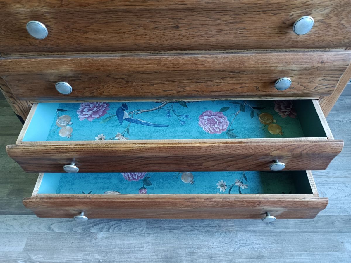 Les tiroirs sont peints en bleu et les fonds de tiroirs sont tapissés de papier sur le même ton et orné de roses et d’oiseaux.