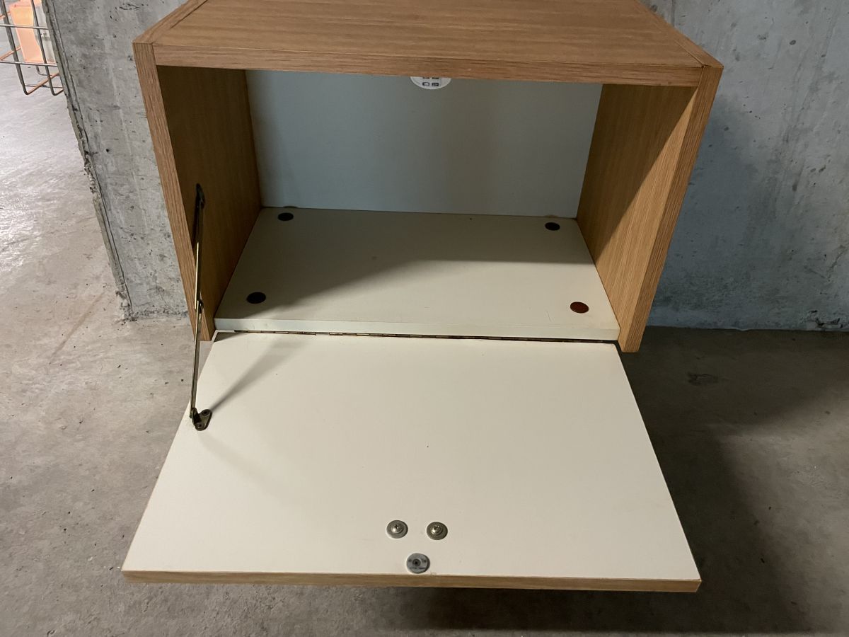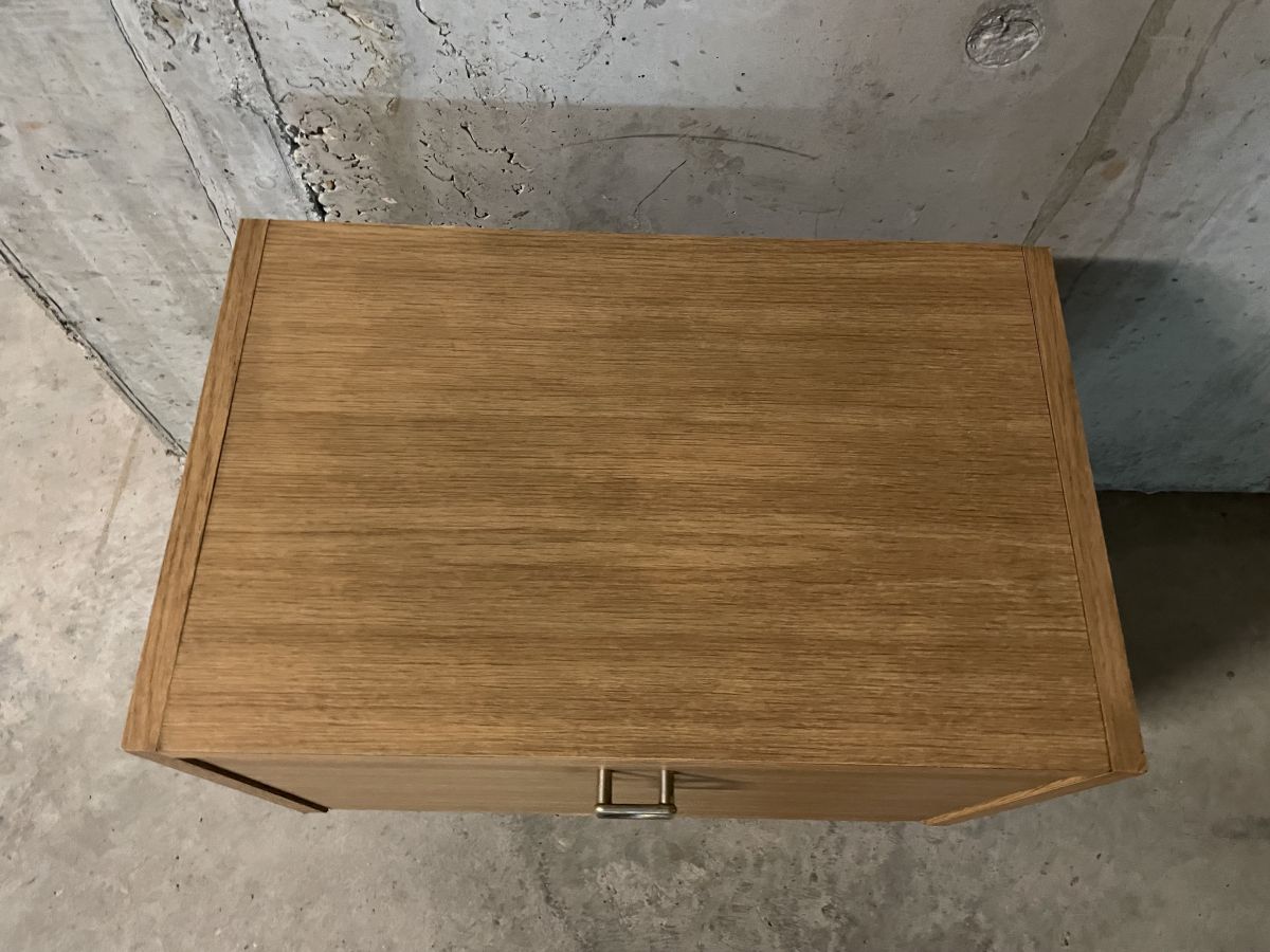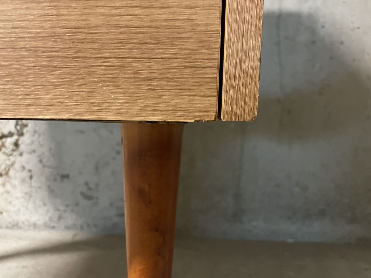 Chevet des années 70, pieds fuseaux en bois, caisson en aggloméré et placage, compartiment à abattant, quelques très légers manques absolument sans conséquence (voir photos), dimensions (cm) : L.47xH.56xP.30, bon état.
