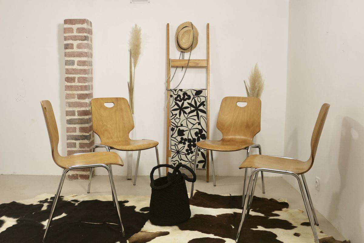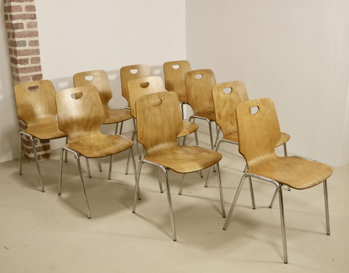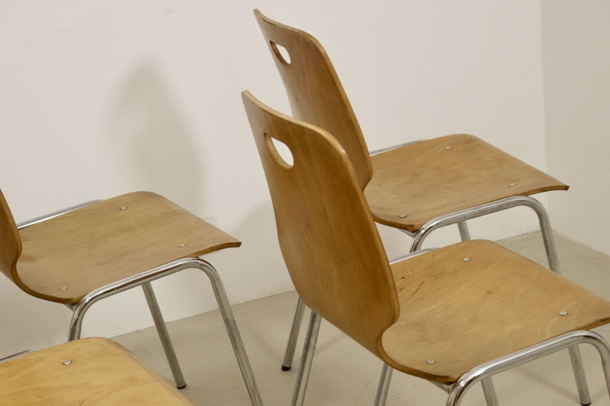 Suite de 10 chaises vintage en contreplaqué Plywood année 80 teck clair, piètement chromé.