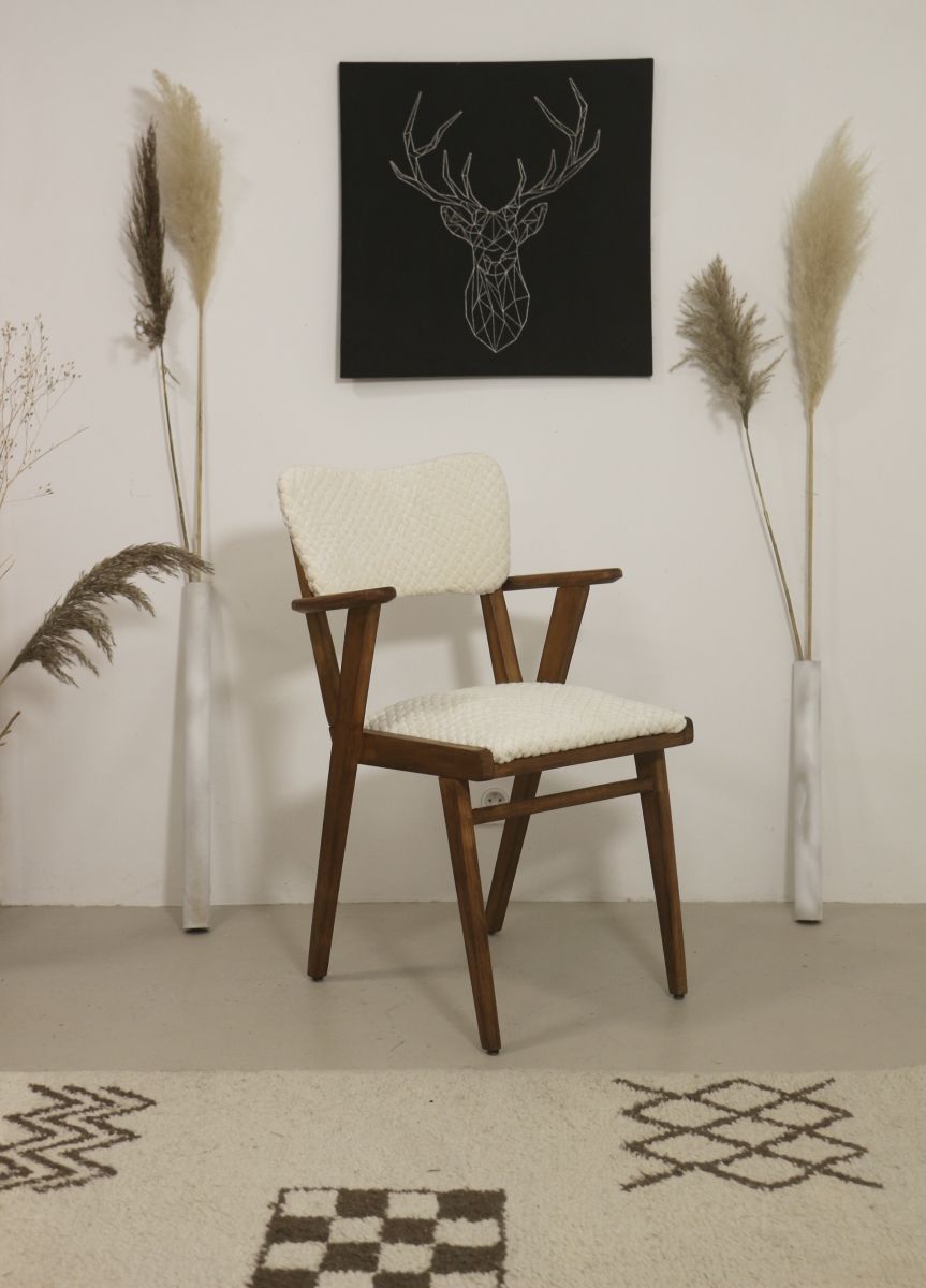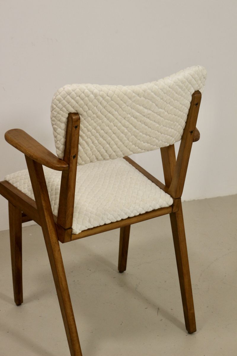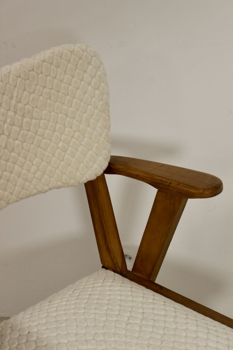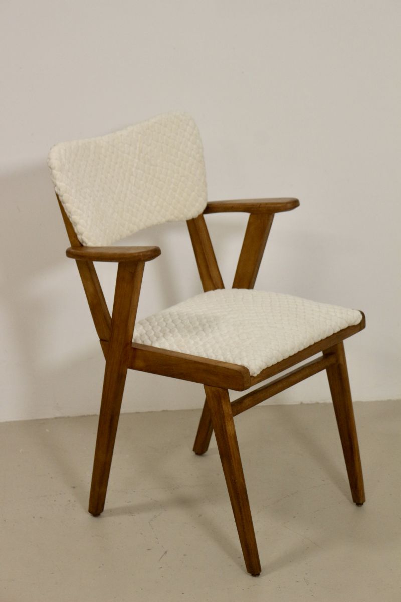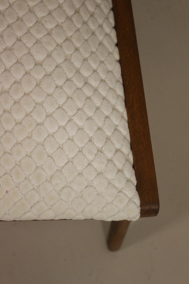 Chaise année 1970 entièrement restaurée le rembourrage a été changé et retapissé dans un tissu blanc cassé en velours jacquard.