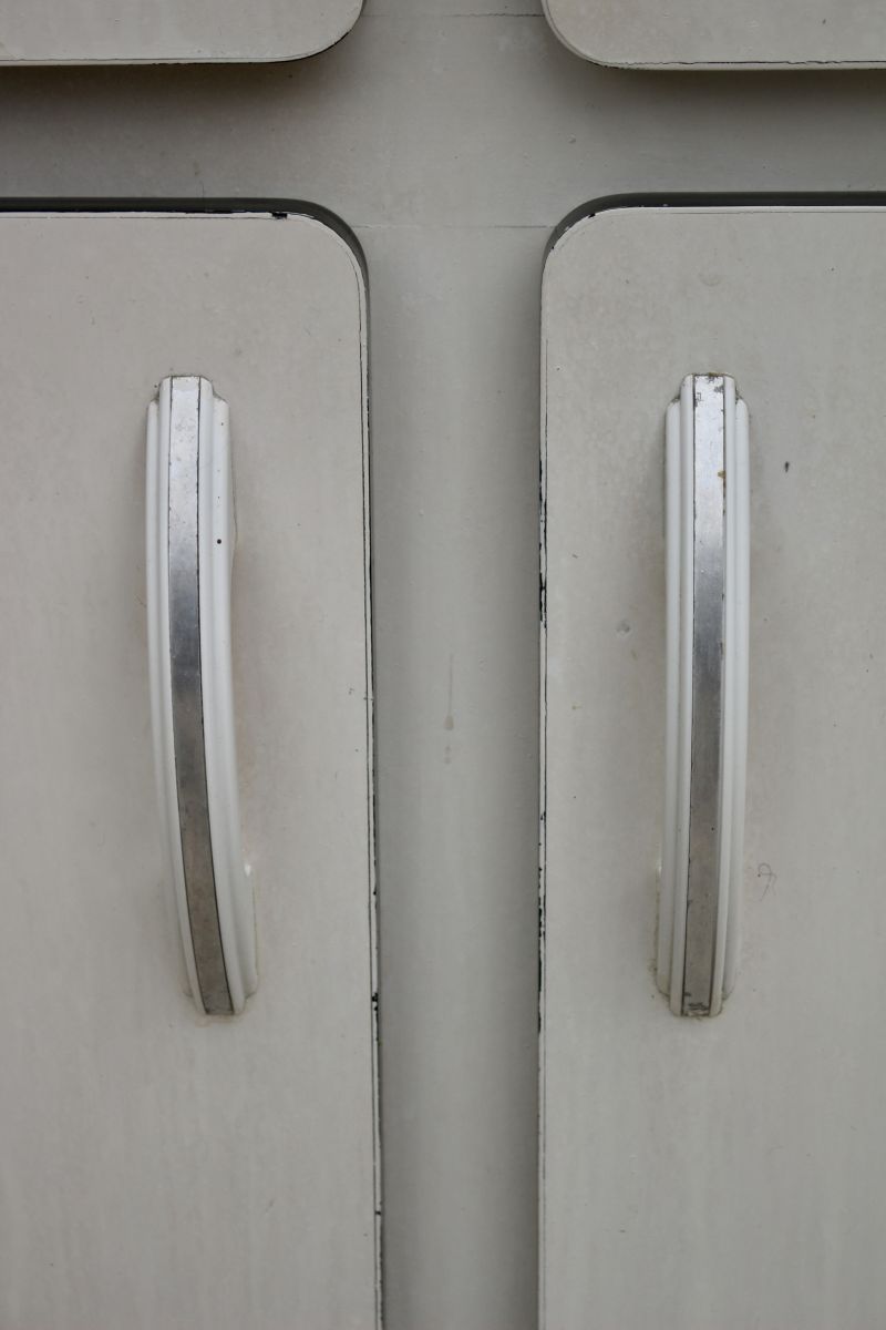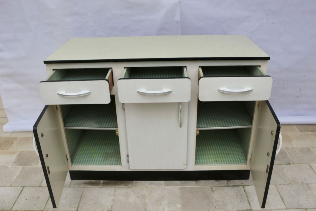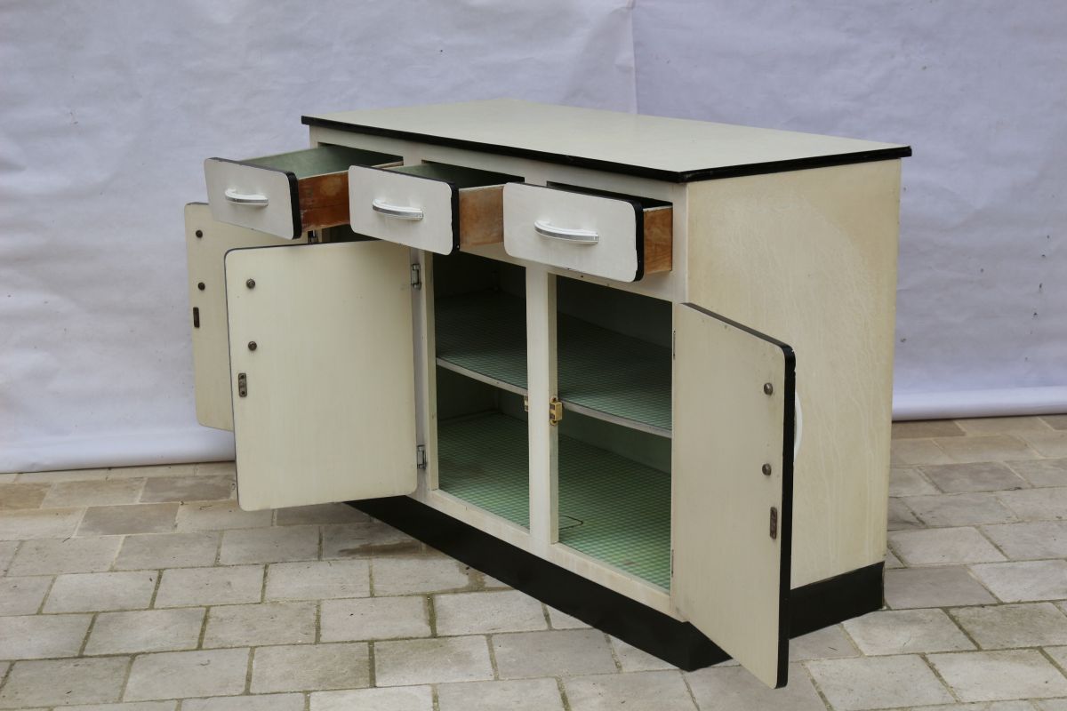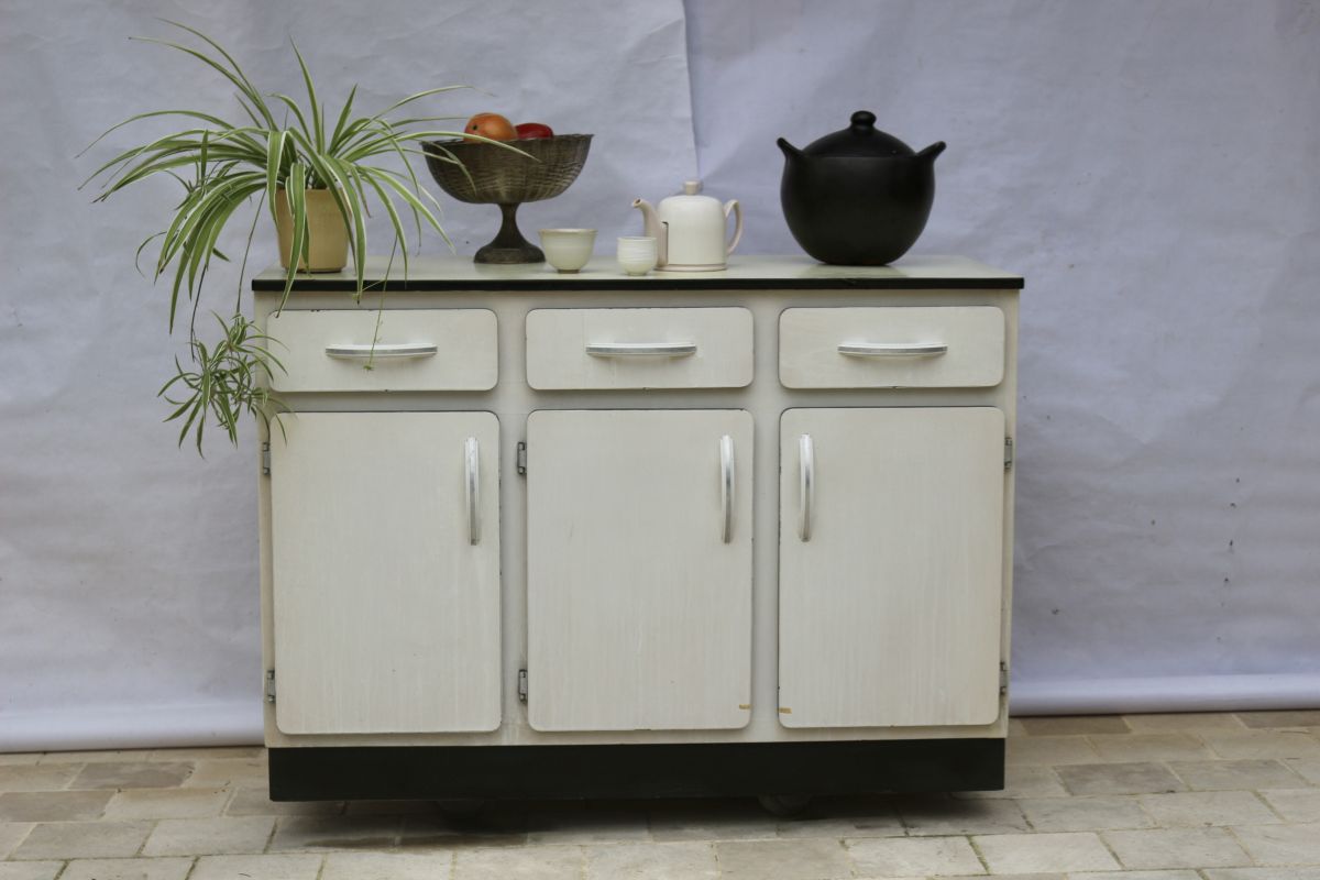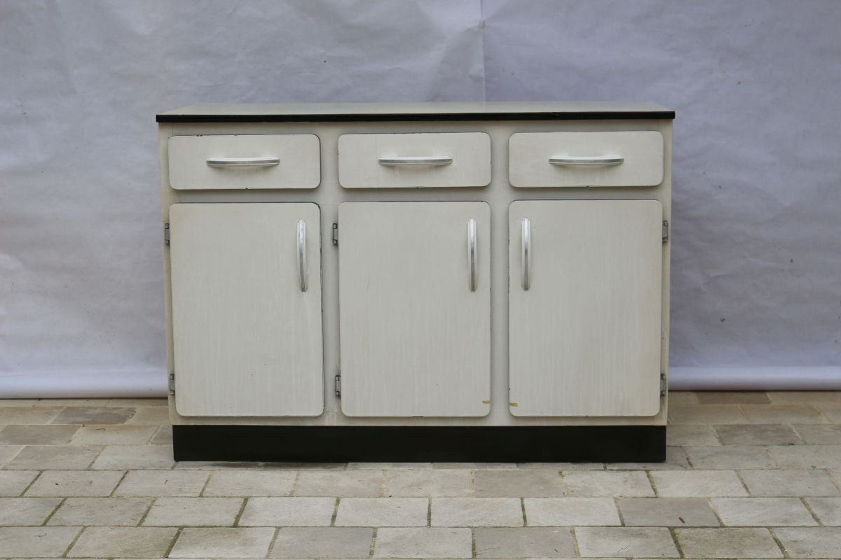Buffet à trois portes battantes aimantées, ouvrant sur 2 tablettes étagère. 3 tiroirs dans la partie supérieure.