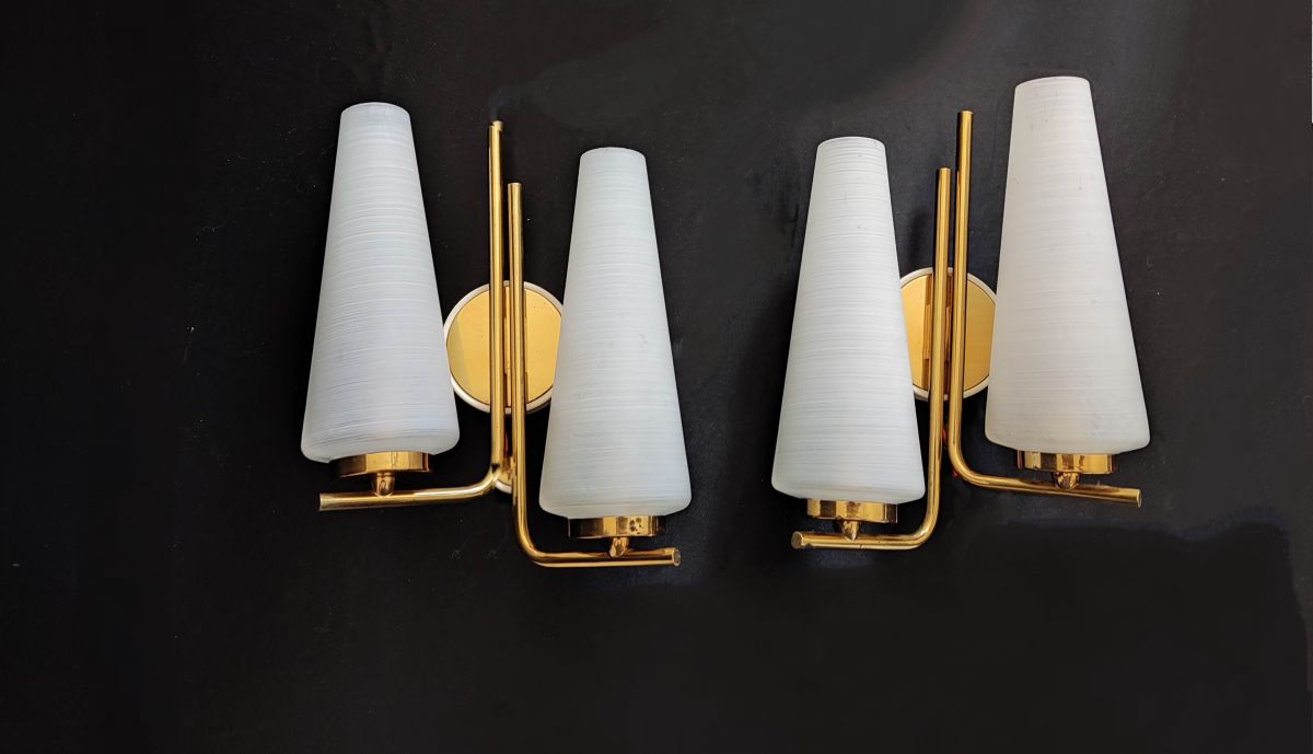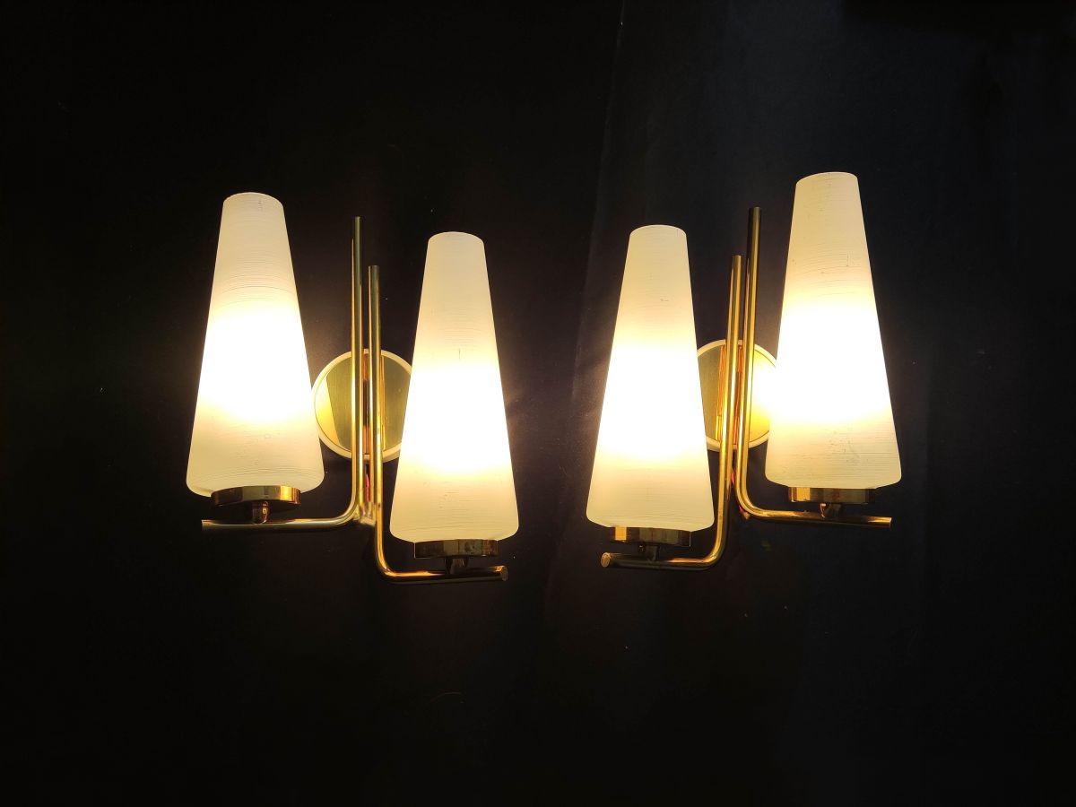 paire d'appliques 2 x 2 feux en laiton et métal blanc avec 4 tulipes en opaline des années 50