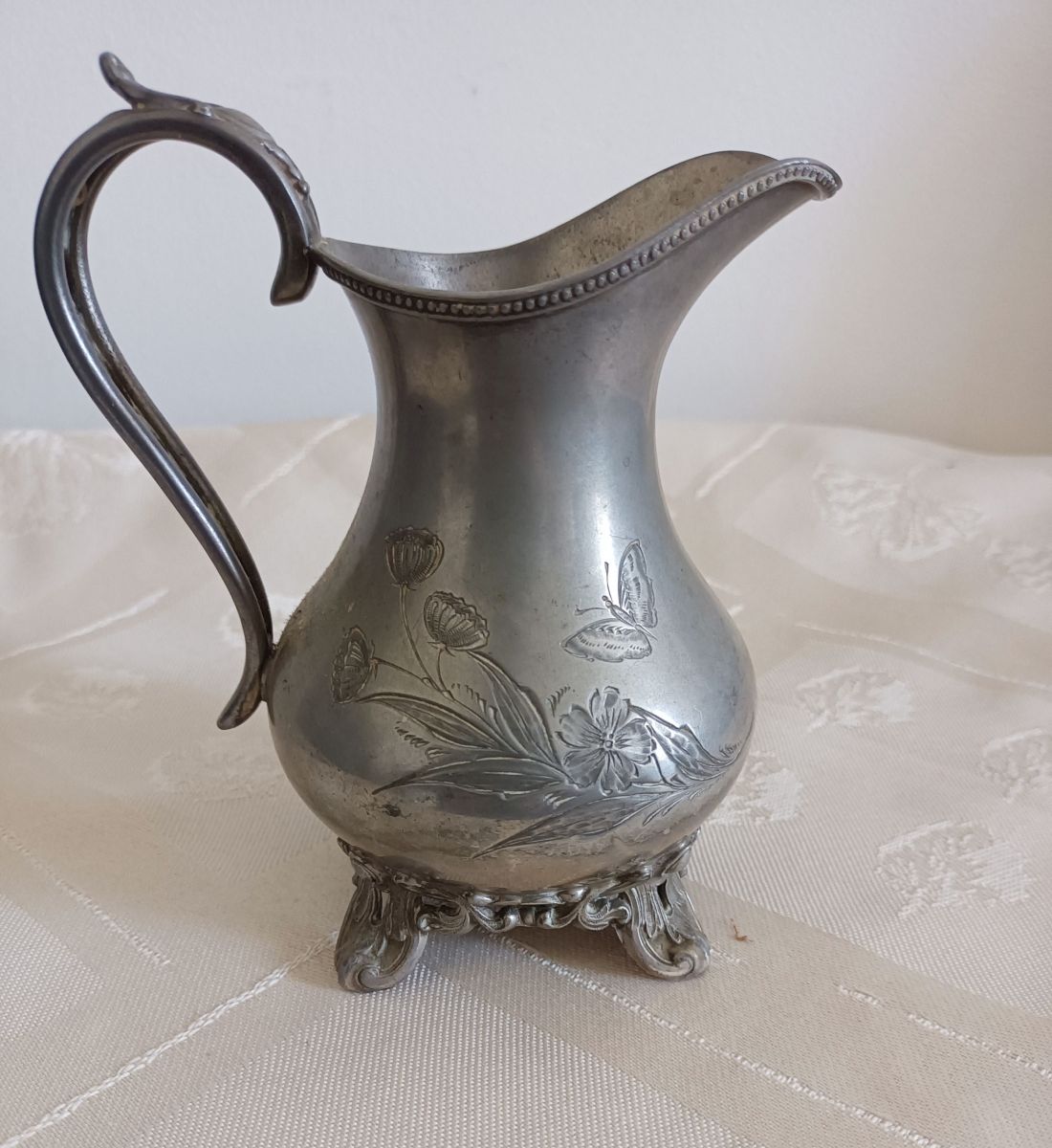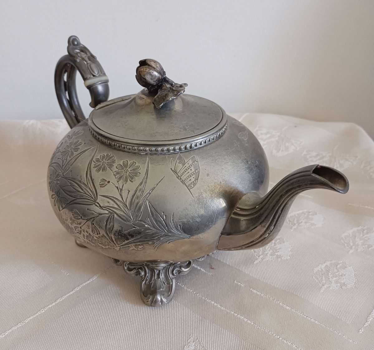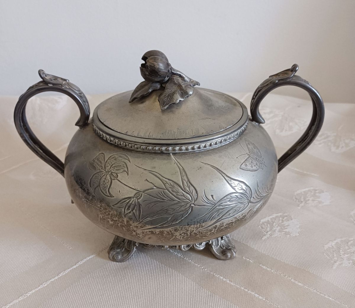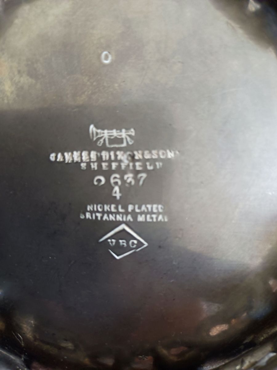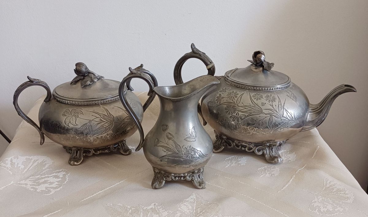 Service anglais SHEIFFIELD décor fleur et papillons. Très joli lot composé d’une théière, d’un pot à lait et d’un sucrier. En étain anglais, le lot est estampillé Sheffield England. Les pieds et les anses sont décorés de motifs ornementaux et les couvercles de la théière et du sucrier sont surmontés d’un gland qui permet une meilleure prise en main.