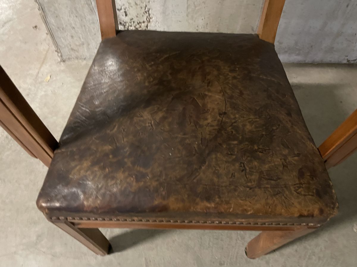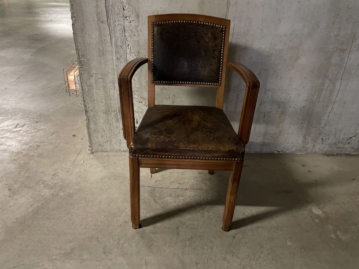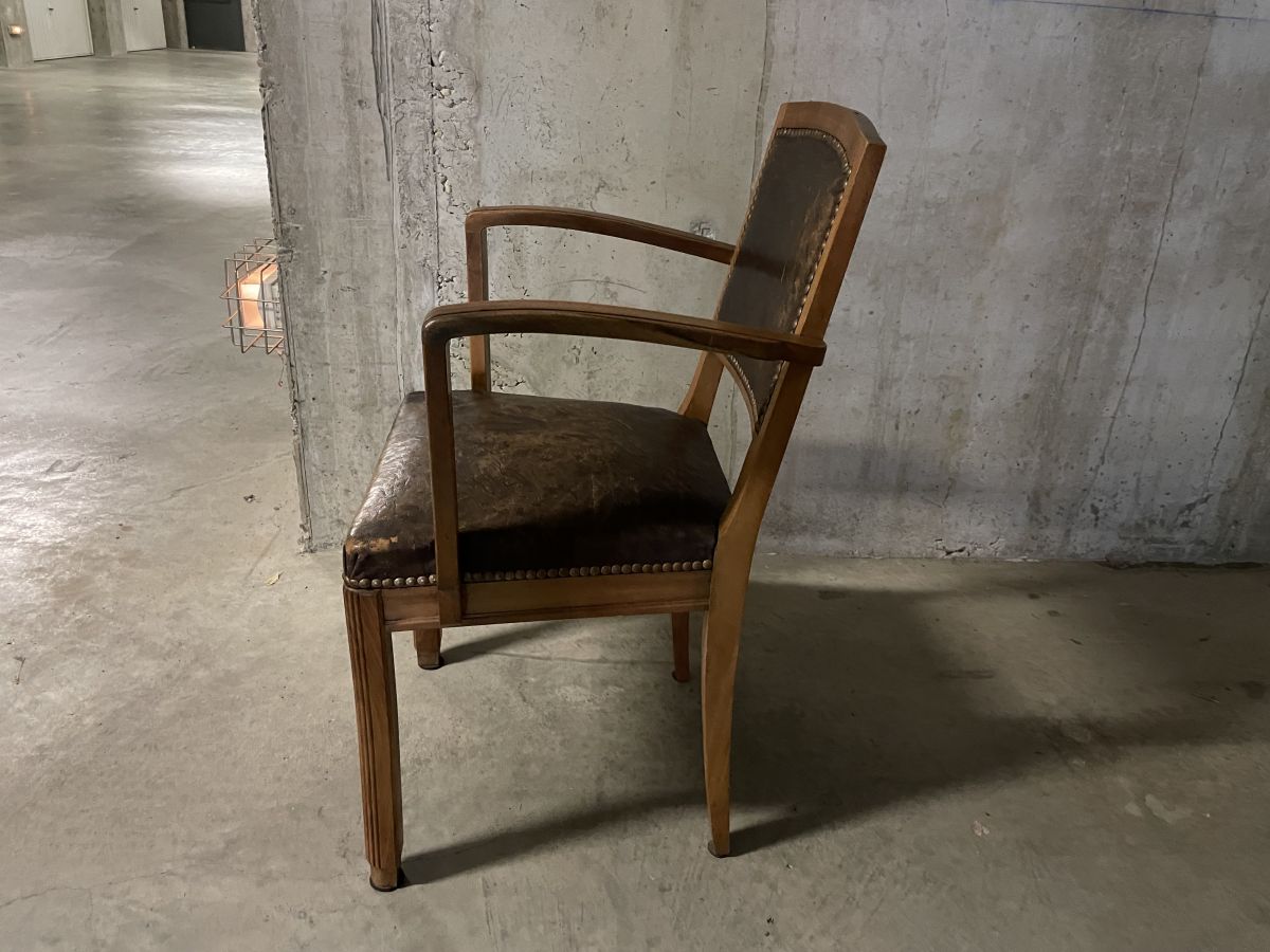Fauteuil bridge des années 40 en bois massif et placage, assise en cuir d’époque, quelques traces du temps (voir photos), hauteur 86cm, hauteur assise 46cm, assise 43x43cm, largeur totale 52cm, profondeur totale 50cm, bon état.