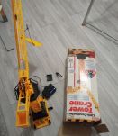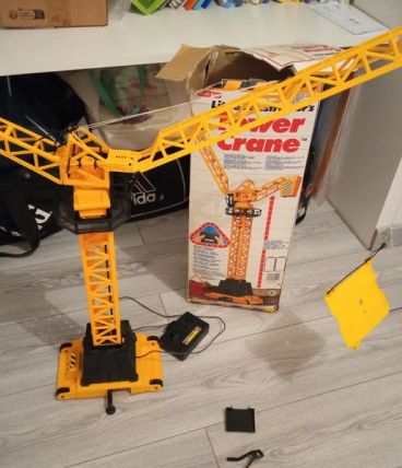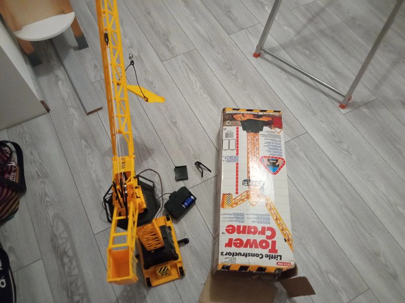 Vends jouet Grue Tower Crane Blue Box vintage, tres bon etat. Fonctionne parfaitement. Vendue avec Les piles. Il manque le cache piles de la telecommande, et Les equipments de portage de la grue. La cage centrale de la grue a ete fragilisee et reparee avec des attaches en plastique.