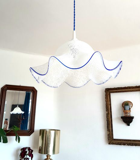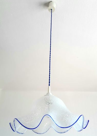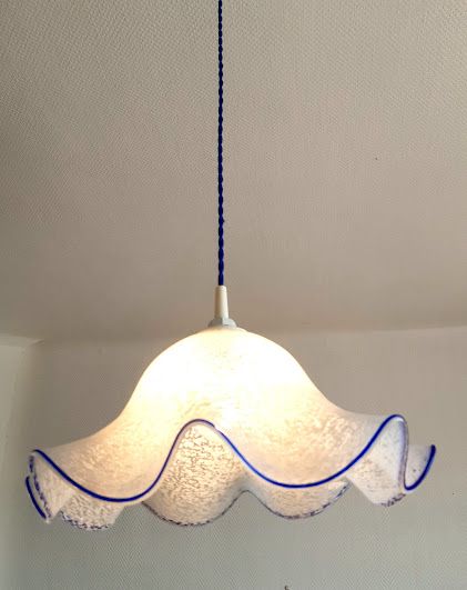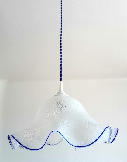 Suspension en verre bleu à corolle. Verre bleu très clair tacheté avec bordure bleu plus foncée.