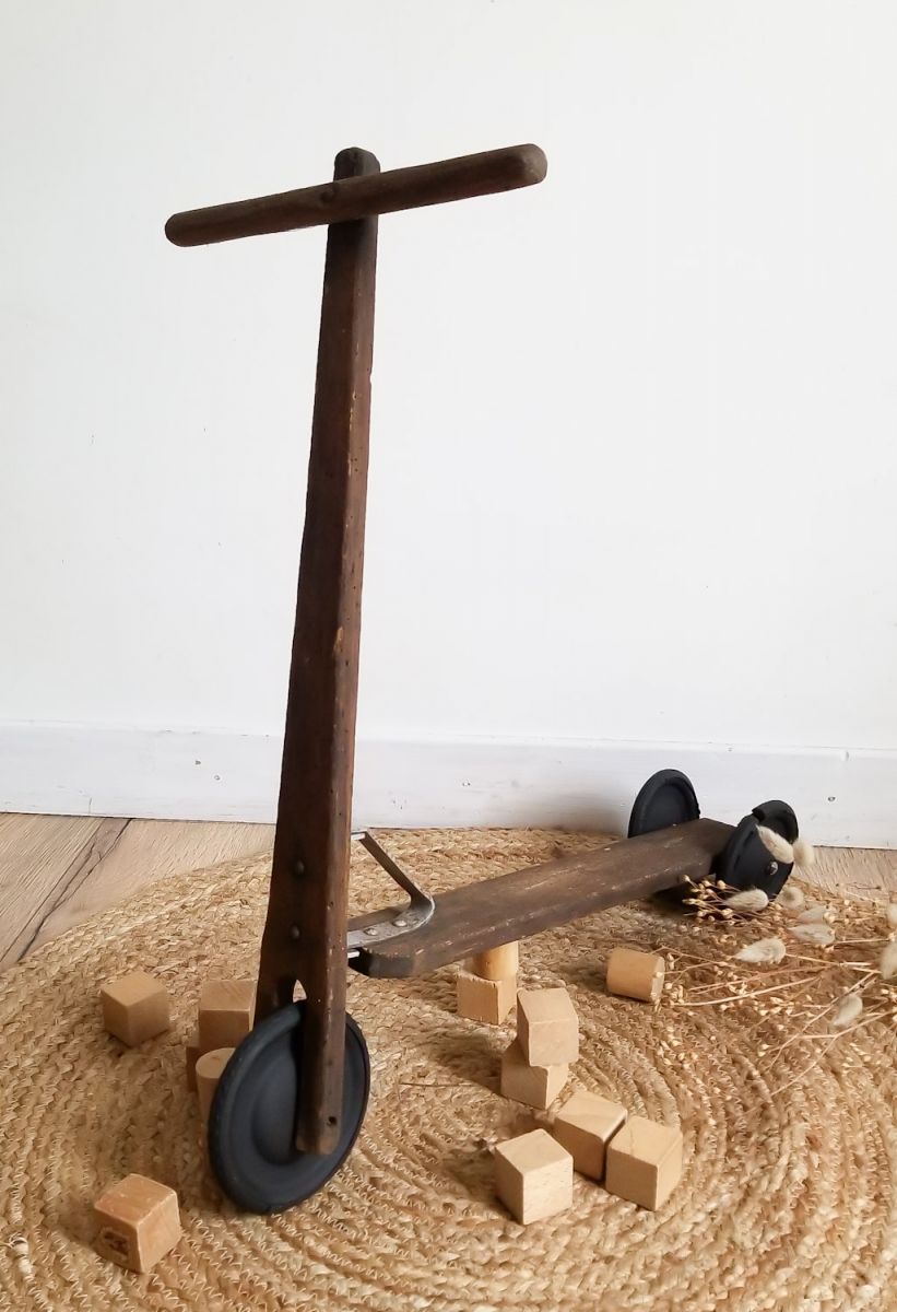 Patinette en bois vintage très jolie en décoration dans une chambre enfant ou pour un mariage vintage