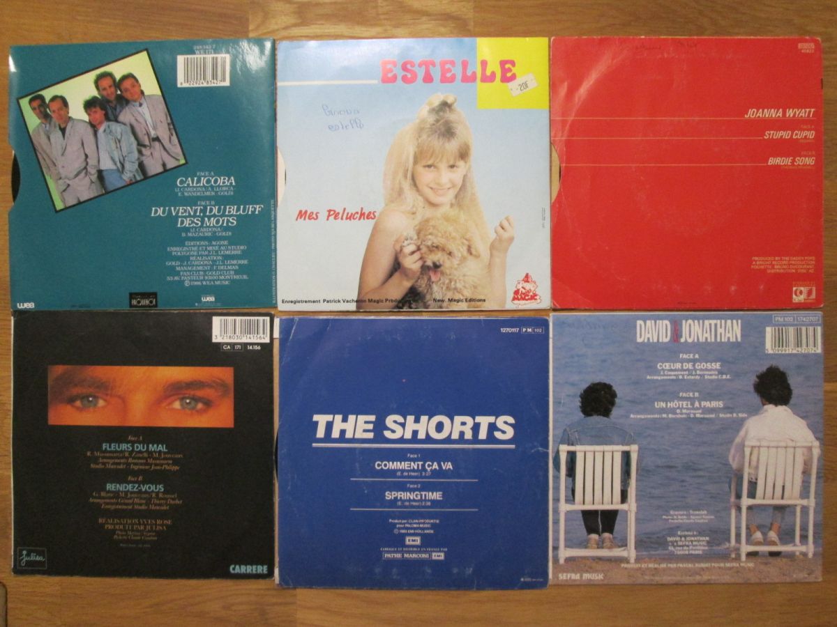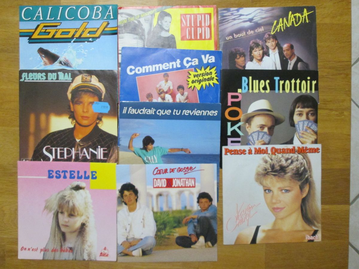 10 disques 45 tours avec leur pochette en bon état de conservation ou état d'usure pour certaines. STEPHANIE Fleurs du mal ¿ GOLD Calicobra ¿ CANADA Un bout de ciel ¿ DAVID ET JONATHAN C?ur de gosse ¿ ESTELLE On n'est plus des bébés ¿ JEAN LUC LAHAYE Il faudrait que tu reviennes ¿ BLUES TROTTOIR Poker ¿ KAREN CHERYL Pense à moi quand même - THE SHORTS Comment ça va - JOANNA WYATT Stupid cupid