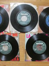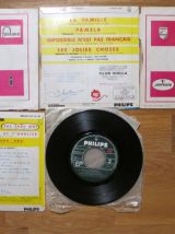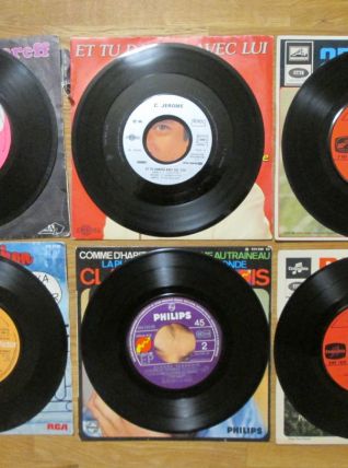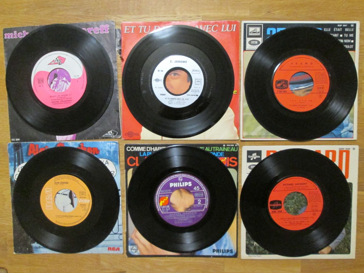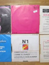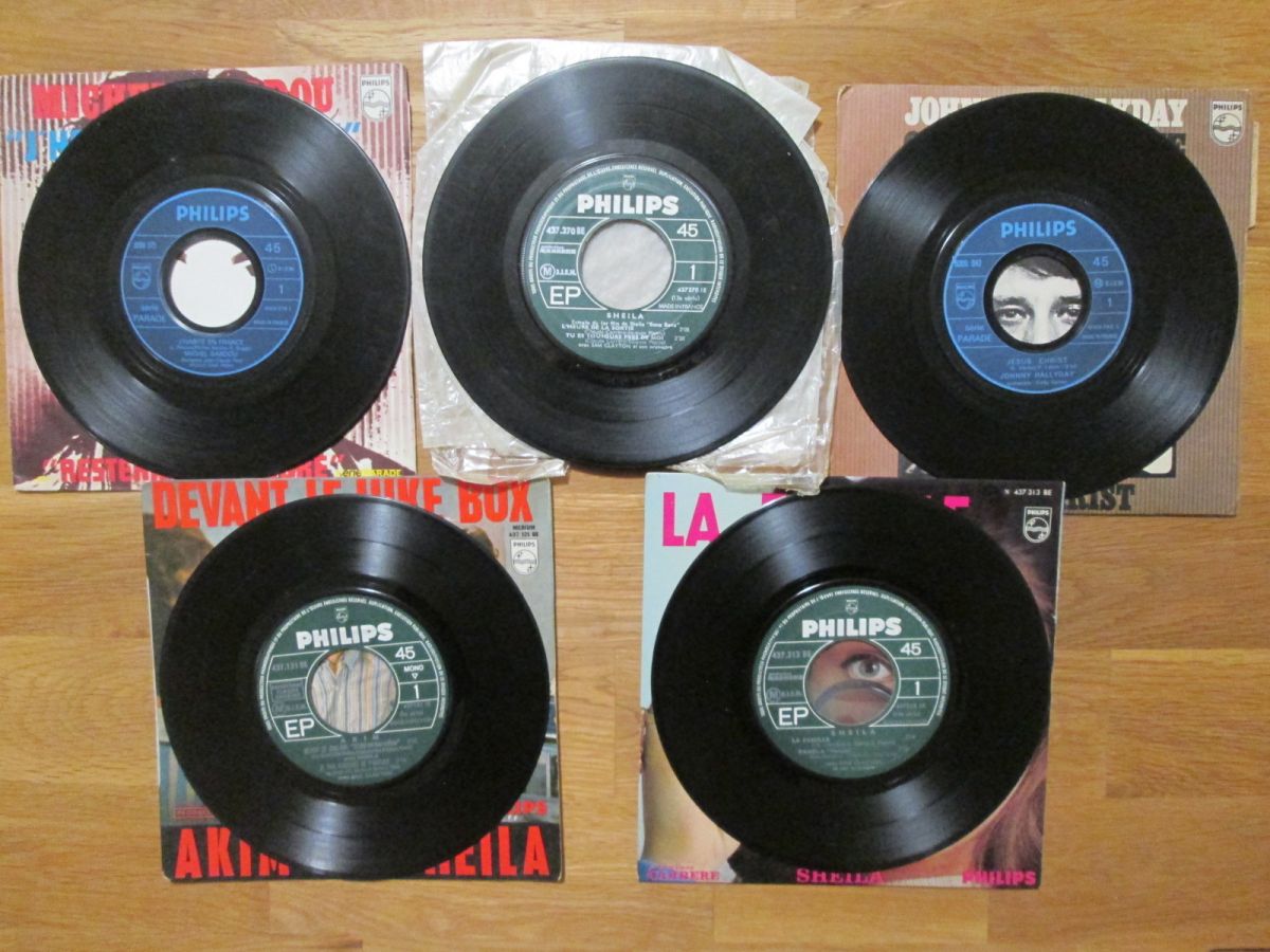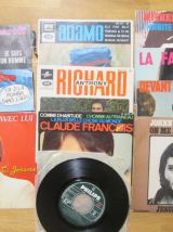 11 disques 45 tours avec leur pochette (sauf 1 disque sans pochette) en état d'usure pour certaines. SHEILA La famille ¿ SHEILA (sans pochette) L'Heure de la sortie + Tu es toujours près de moi + La vie est un tourbillon + Le plus joli métier du monde - MICHEL SARDOU J'habite en France ¿ JOHNNY HALLYDAY On me recherche ¿ CLAUDE FRANCOIS Comme d'habitude + L'homme au traineau + La plus belle chose dumonde ¿ ALAIN SOUCHON Le p'tit chanteur + Y'a d'la rumba dans l'air ¿ MICHEL POLNAREFF Gloria +...
