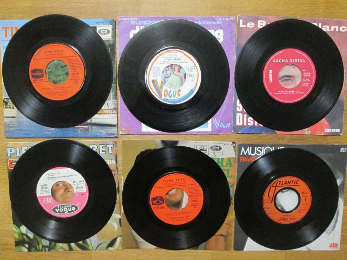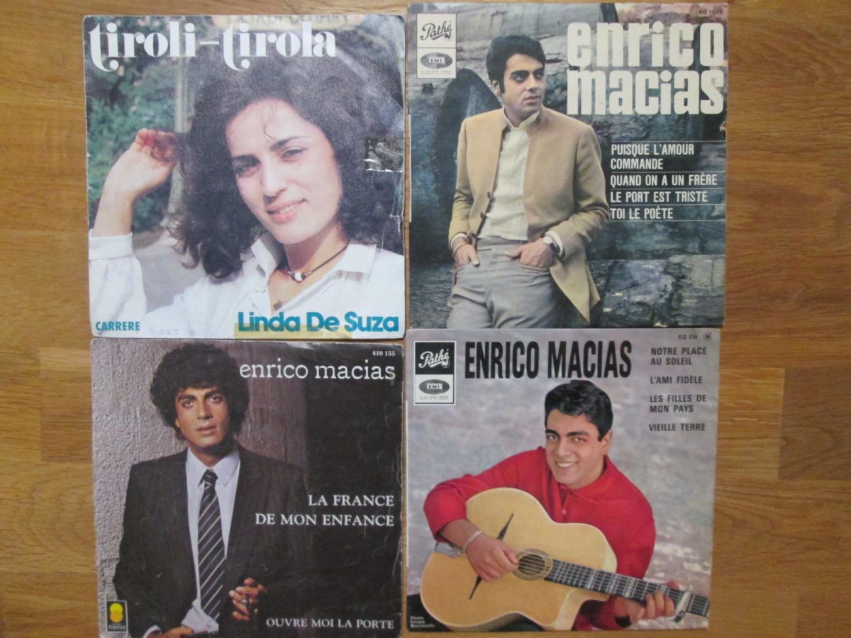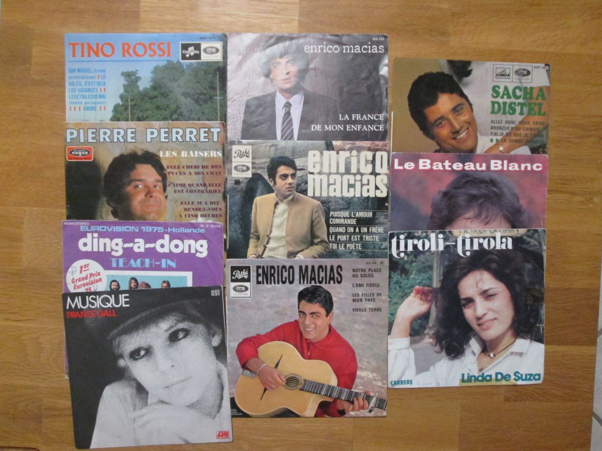 10 disques 45 tours avec leur pochette : certaines sont en mauvais état ou ont des annotations. PIERRE PERRET Les baisers + Elle cherche des puces à son chat + J'aime quand elle est contrariée + Elle m'a dit rendez-vous à cinq heures - SACHA DISTEL Le bateau blanc + Belles jambres mais alors qu'elle tête ¿ SACHA DISTEL Allez donc vous faire bronzer + Du chinois + T'ai-je dit que je t'aime + La bonne humeur - LINDA DE SUZA Tiroli tirola + Naô te cases ¿ ENRICO MACIAS La France de mon enfance +...