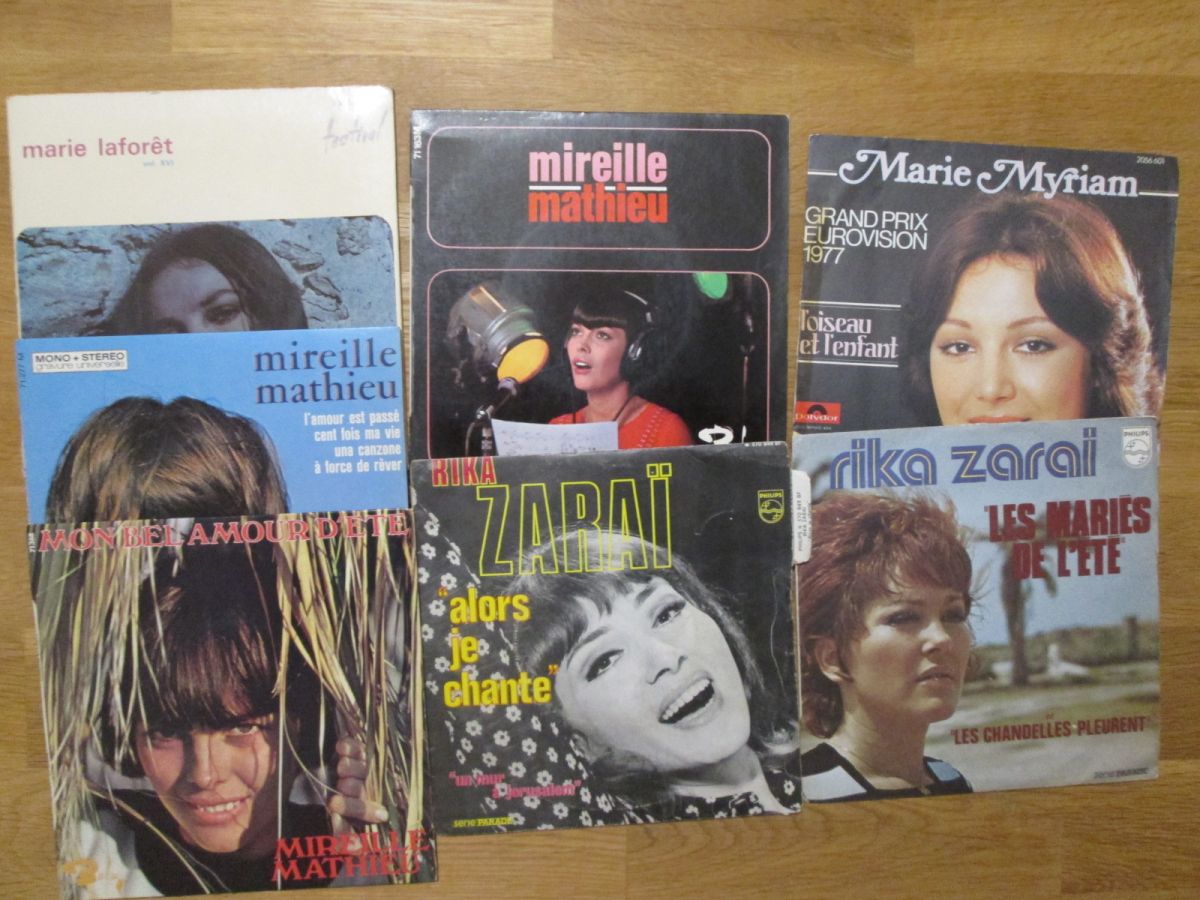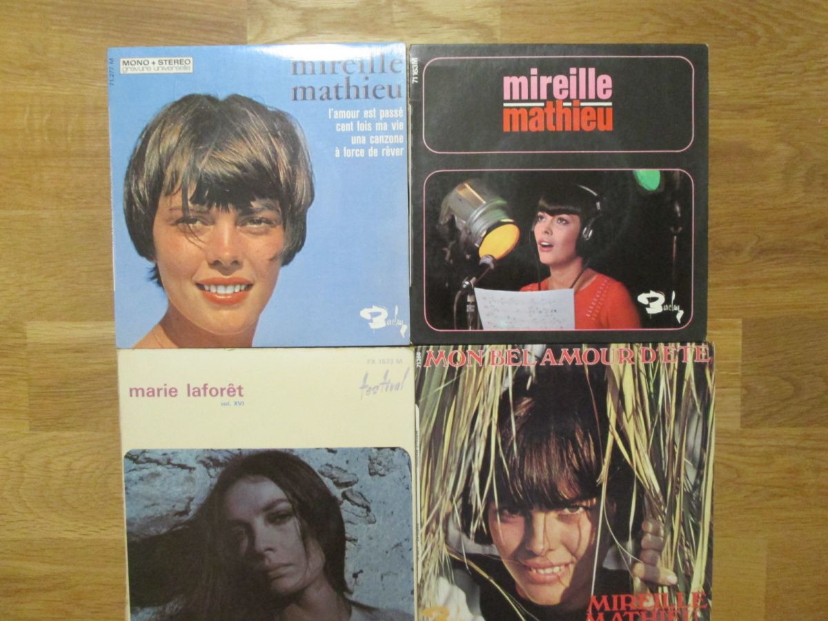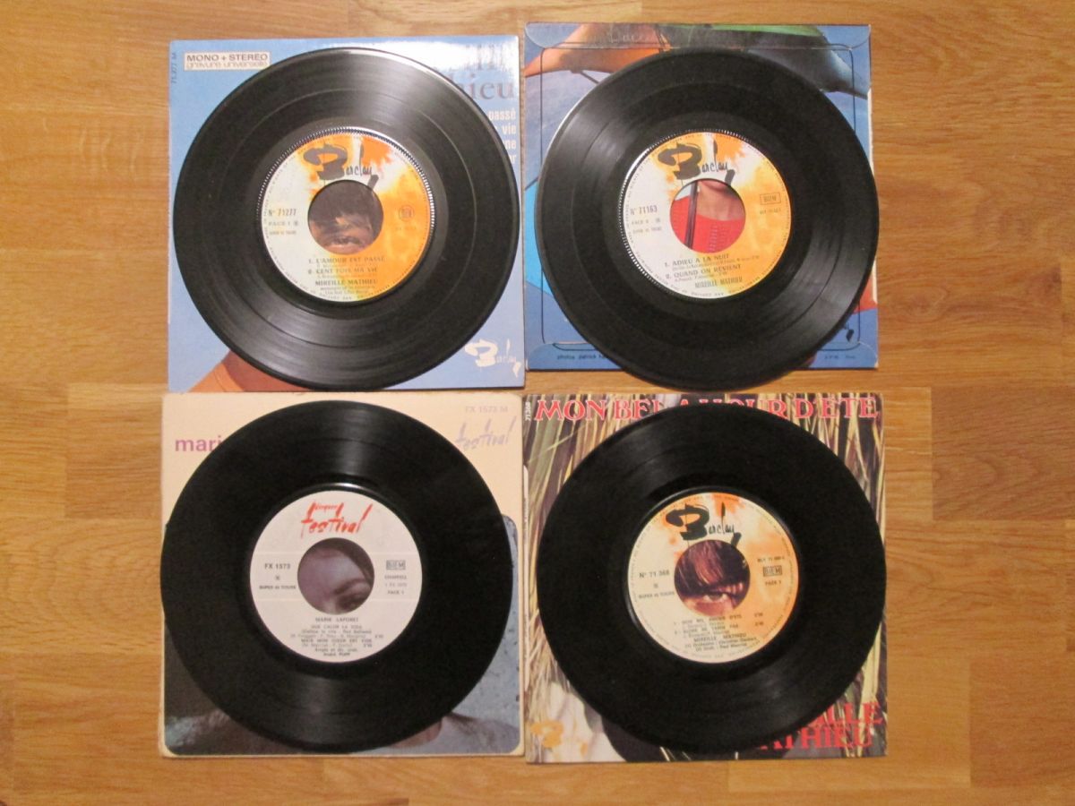 7 disques 45 tours avec leur pochette : certaines sont en mauvais état ou ont des annotations. MIREILLE MATHIEU Nous on s'aimera + Pour un c?ur sans amour + Adieu la nuit + Quand on revient ¿ MIREILLE MATHIEU L'amour est passé + Cent fois ma vie + Una canzone + A force de rêver ¿ MIREILLE MATHIEU Mon bel amour d'été + Alors ne tarde pas + Vivre pour toi + On dit qu'elle était belle ¿ MARIE LAFORET Que calor la vida + Mais mon c?ur est vide + La valse des petits chiens blancs + Requiem pour trois...