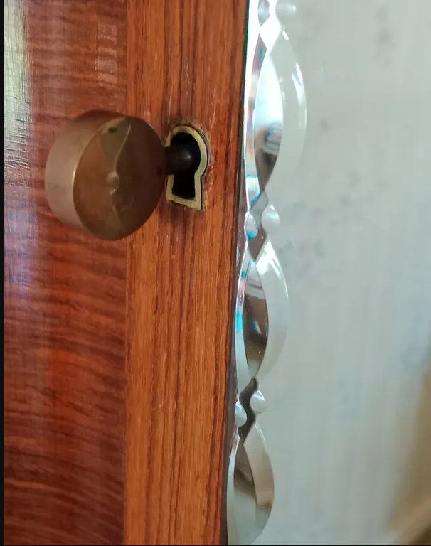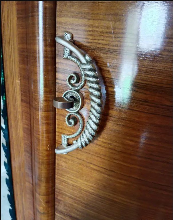 Marque : ARMOIRE EN BOIS MASSIF : 3 PORTES DONT UNE AVEC 1 GLACE, 2 POIGNEES EN LAITON, DE NOMBREUSES ETAGERES