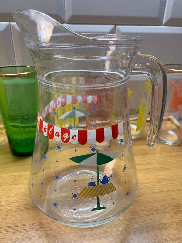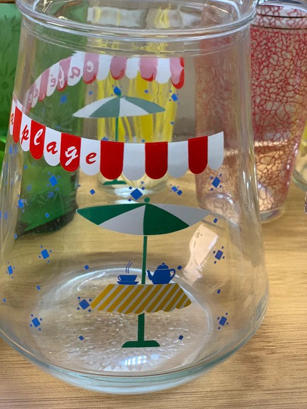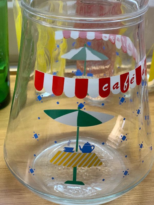Grand pichet vintage avec motif de « thé au jardin » (parasol, nappe jaune, théière et tasse avec contenant chaud) et mention Café de la plage…