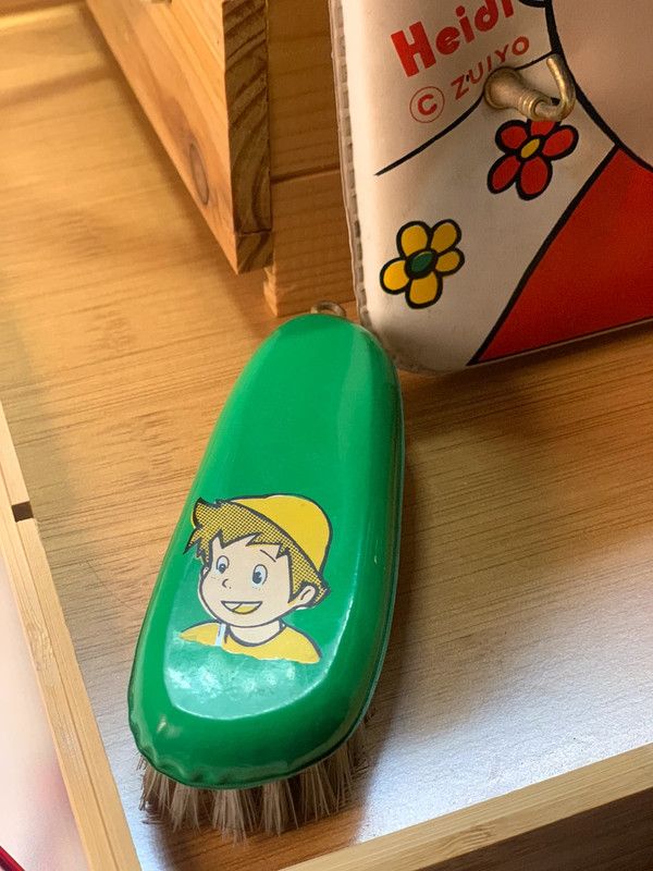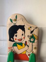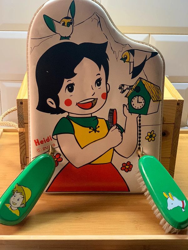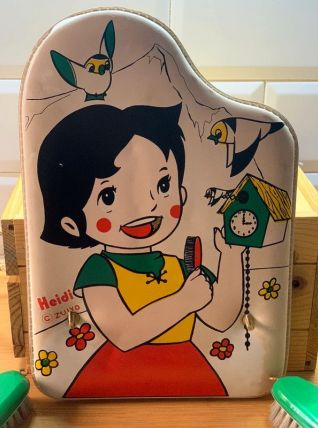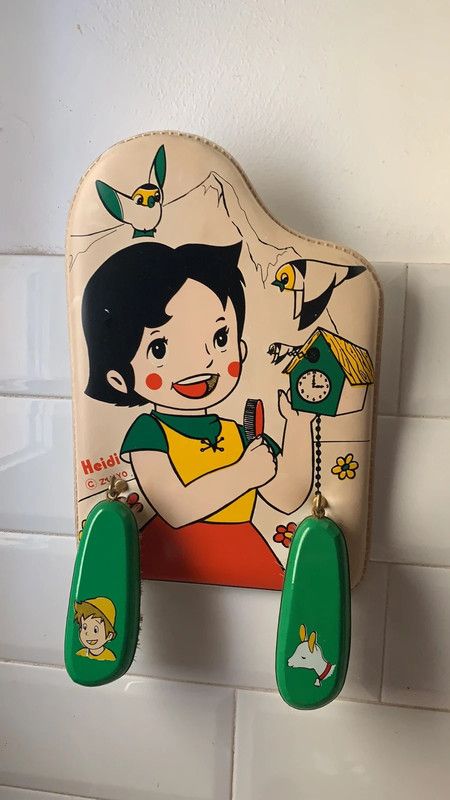 1. La base avec motif de Heidi à la montage avec 2 petits oiseaux, des fleurs. Elle tient dans sa main une horloge et une brosse… Il y a 2 crochets pour