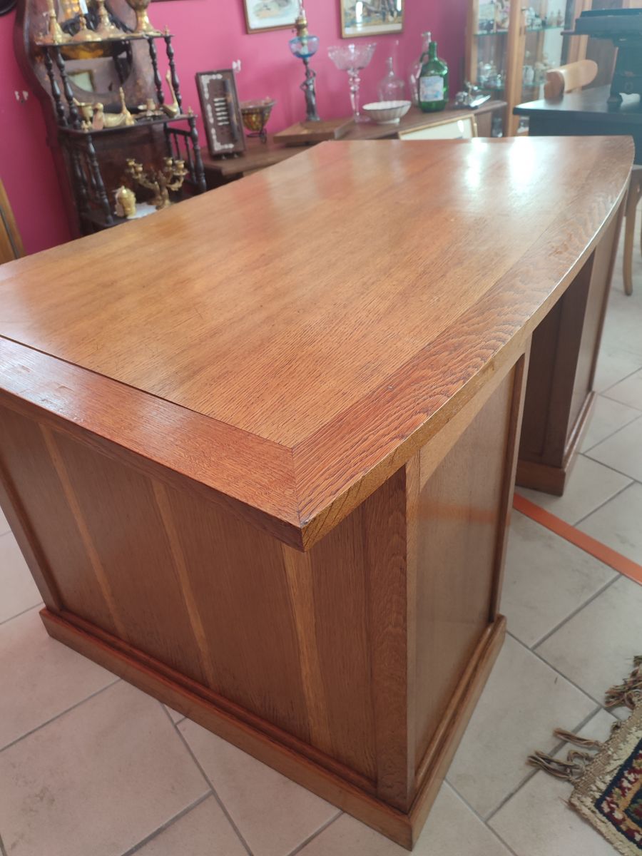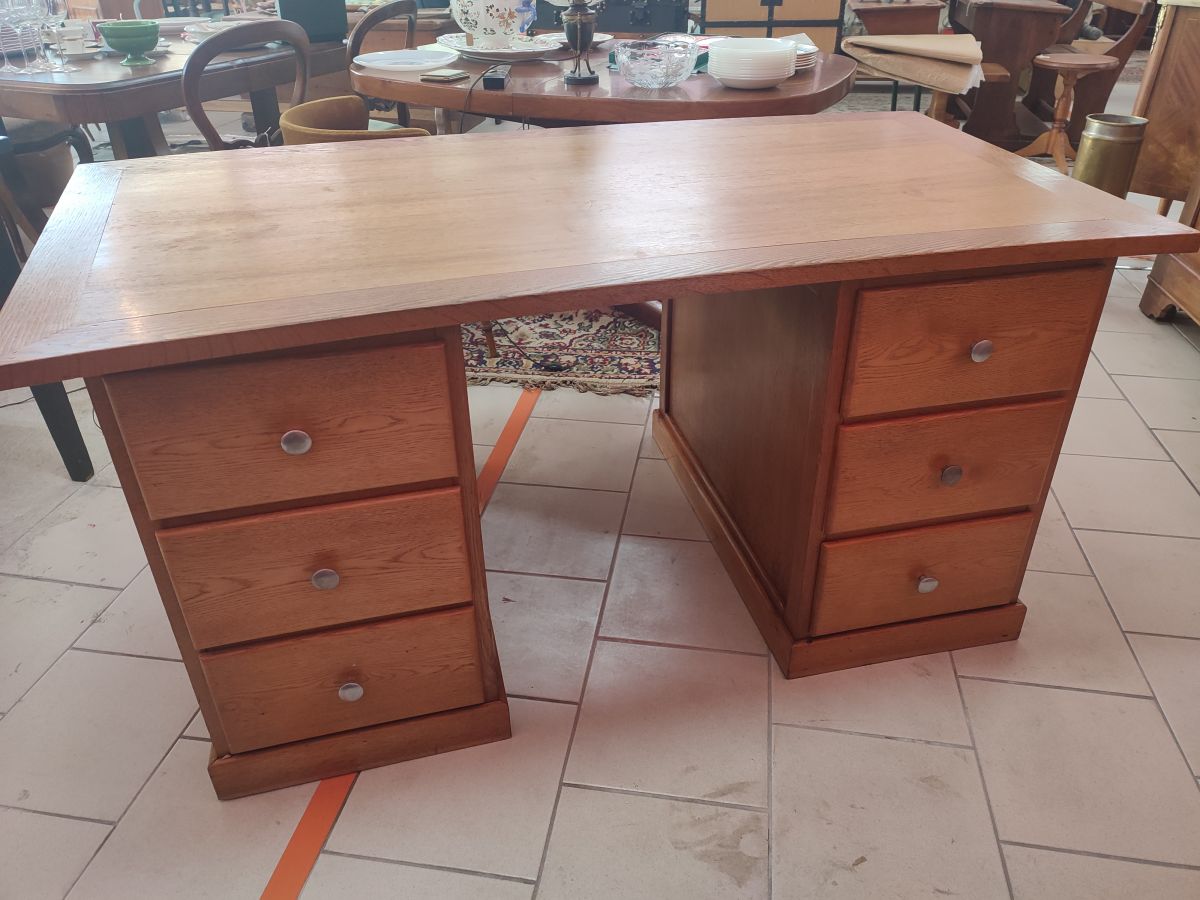 Très grand bureau d'administration doté d'un plateau convexe et de 2 caissons de 3 tiroirs chacun.