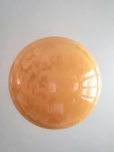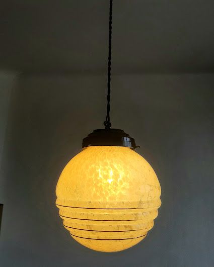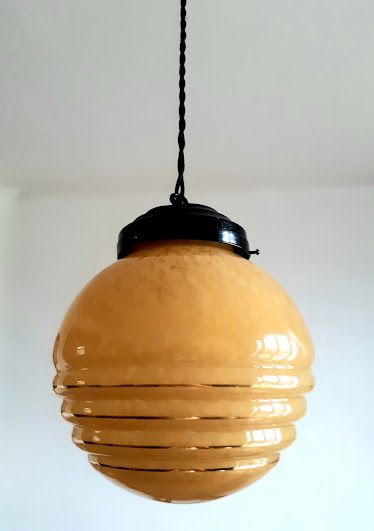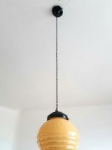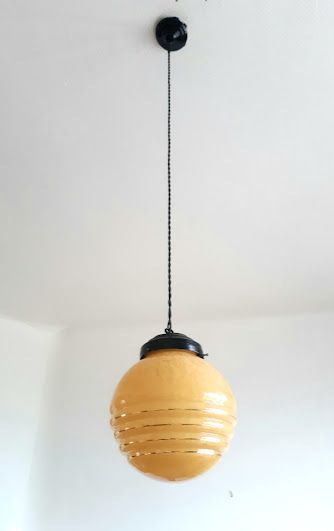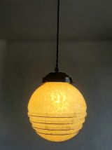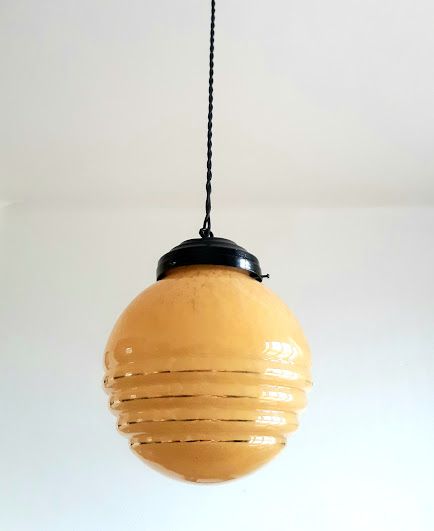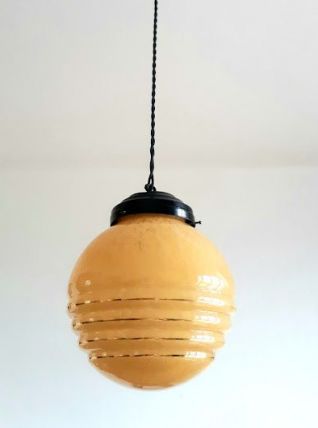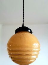 Suspension composée d'un globe vintage en verre rond couleur miel tâcheté à trois godrons. Monté à l'électricité avec un support en métal noir et un fil en tissu torsadé également noir, électricité neuve et fonctionnelle.