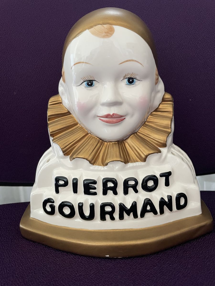 Présentoir buste de Pierrot Gourmand série limitée à 2000 exemplaires pour les 75 ans de la marque. Un petit manque de doré sur le bas sans incidence avec la beauté du buste. Très bel objet Rare.