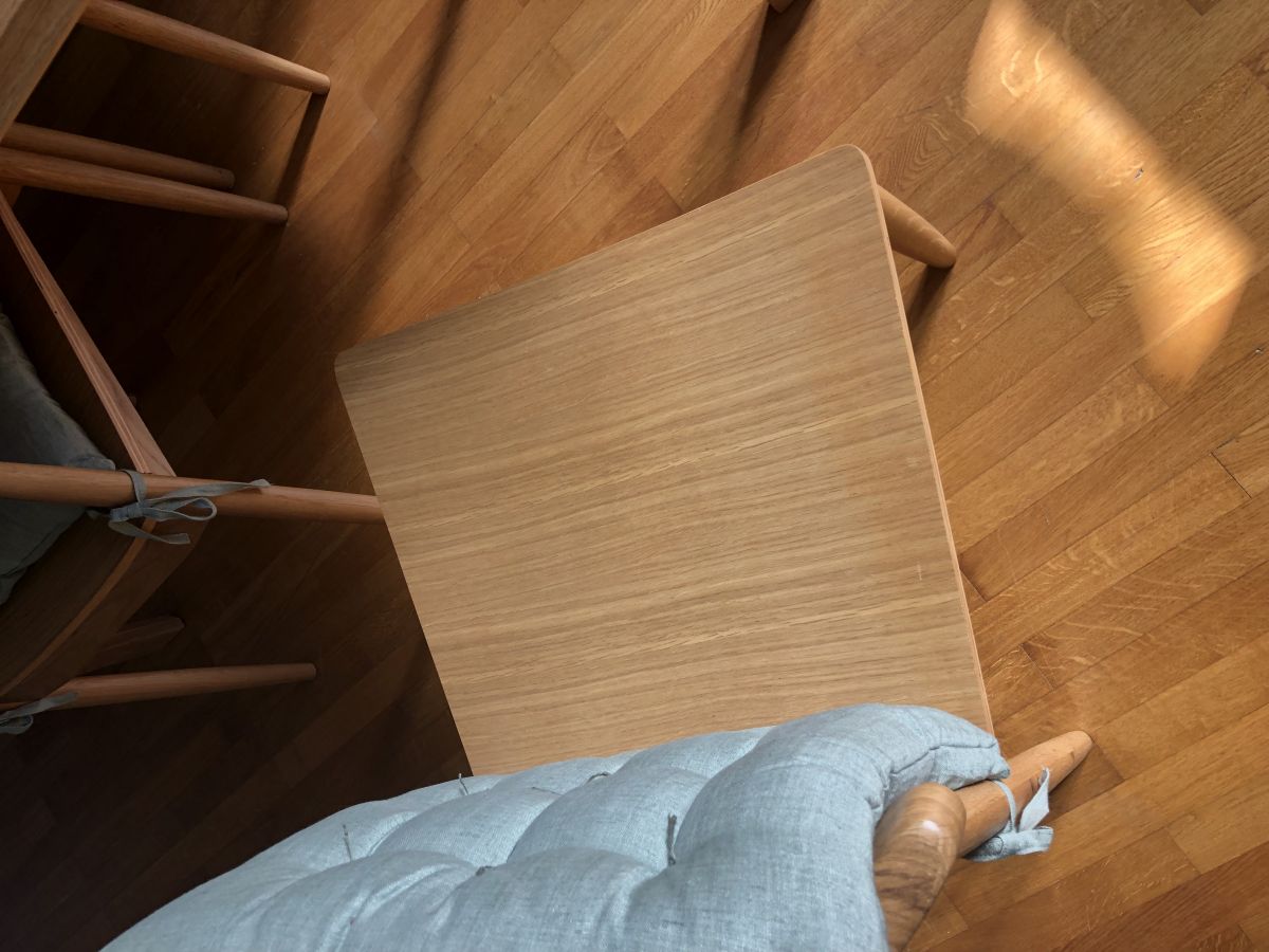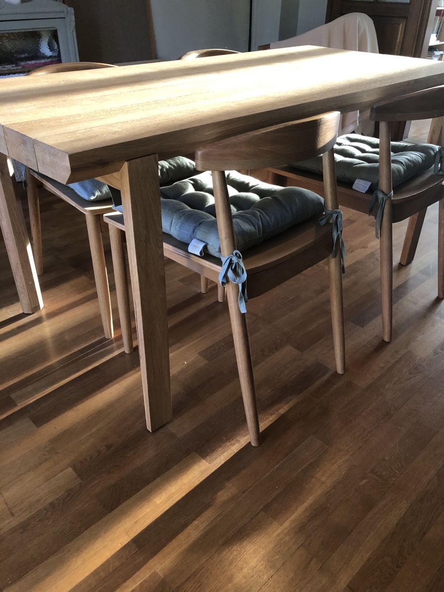 Tout est en excellent état. Seules deux minis rayures sur la table mais nous l’avions reçu ainsi. Elle a toujours été protégée et les assises des chaises également.