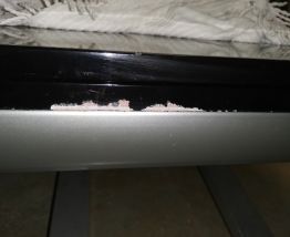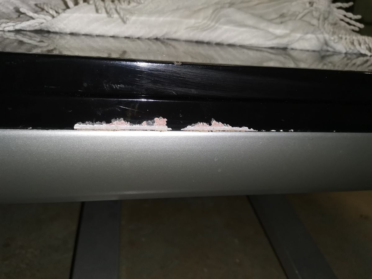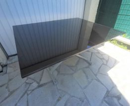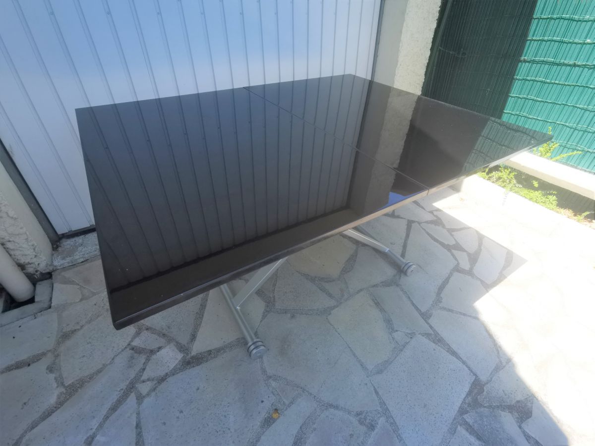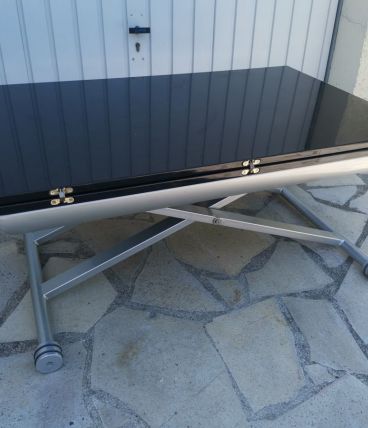 Piètement aluminium avec vérin pour ajuster la hauteur du plateau plateau bois laqué noir un petit éclat sur un champ (photo)