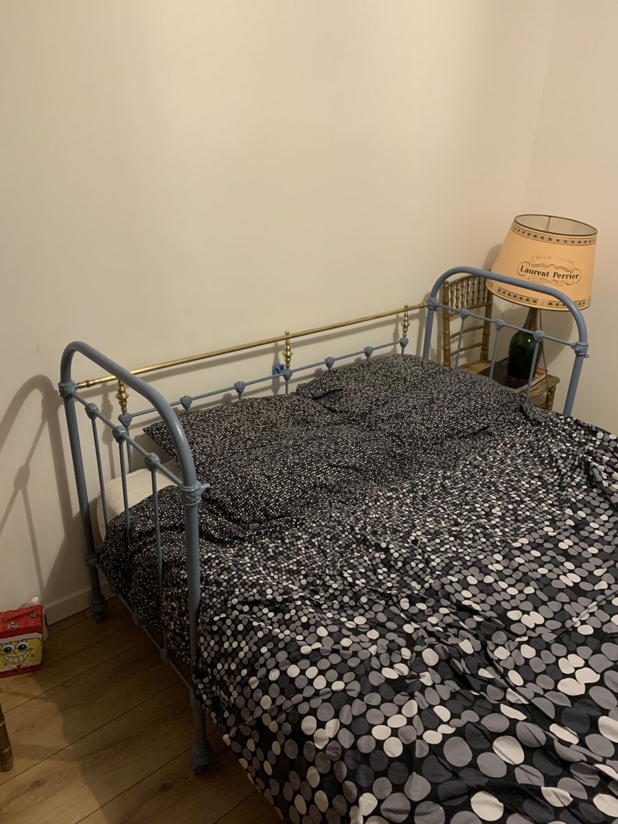 Banquette en fer forgé, c'est un ancien lit de bébé des années 20.