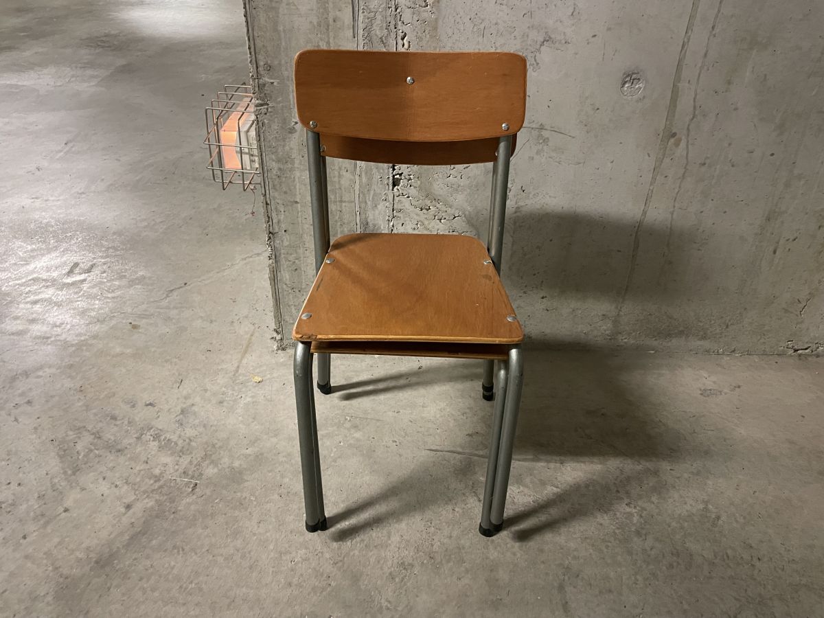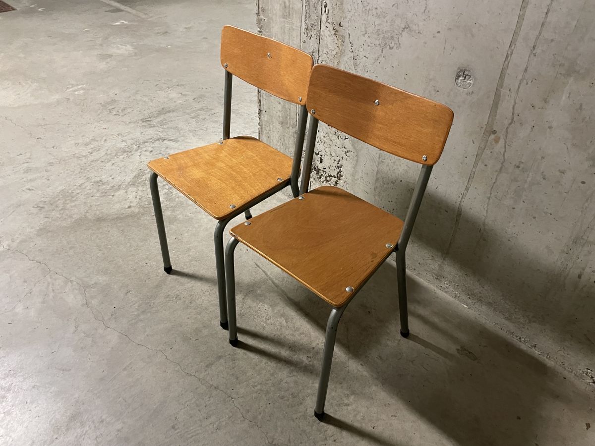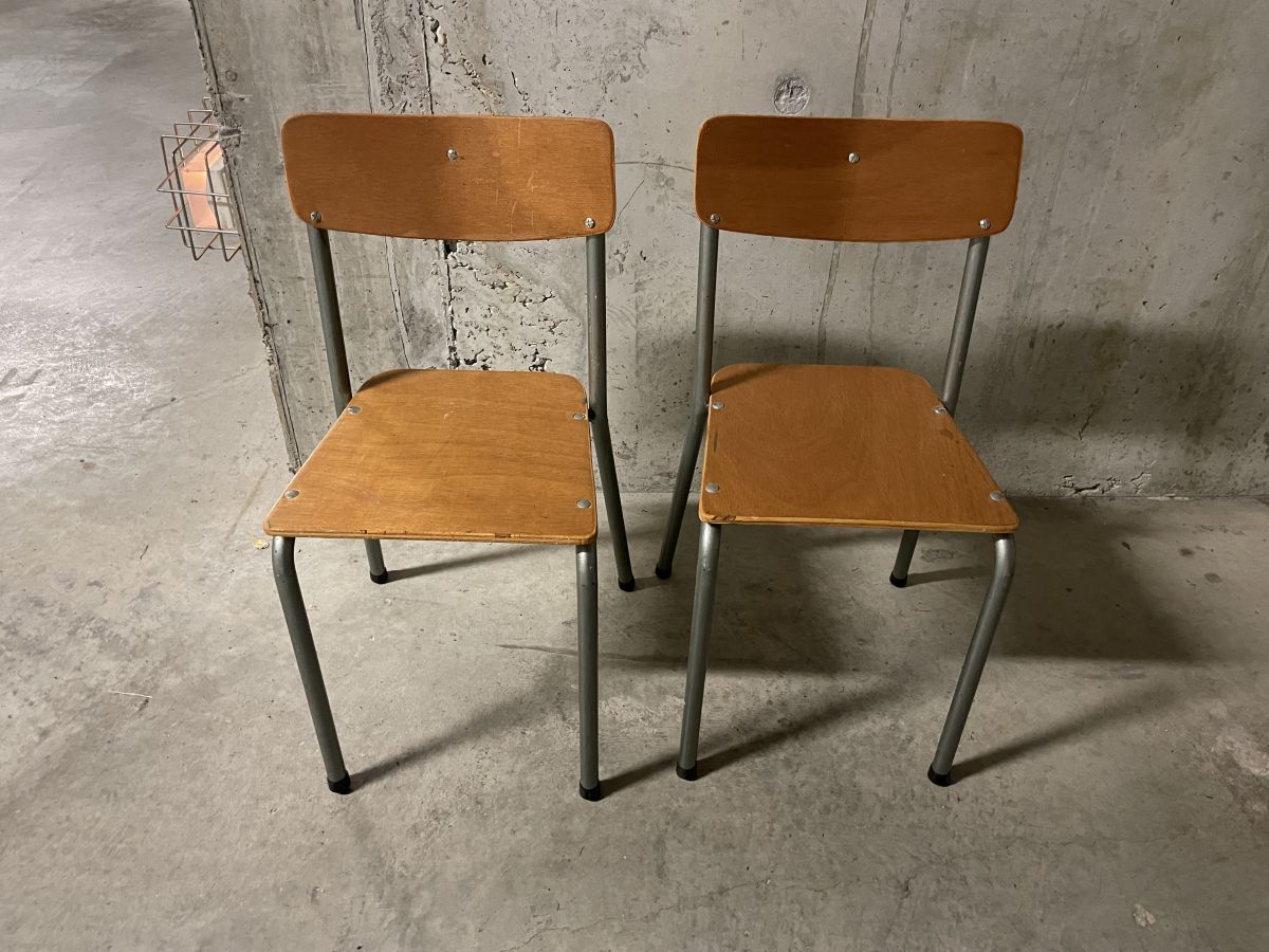 Paire de chaises d’écoliers pour enfants des années 80, bois et métal, superbe patine, empilables, traces d’usage (voir photos), hauteur 66cm, hauteur assise 36cm, assise 30x30cm, bon état.