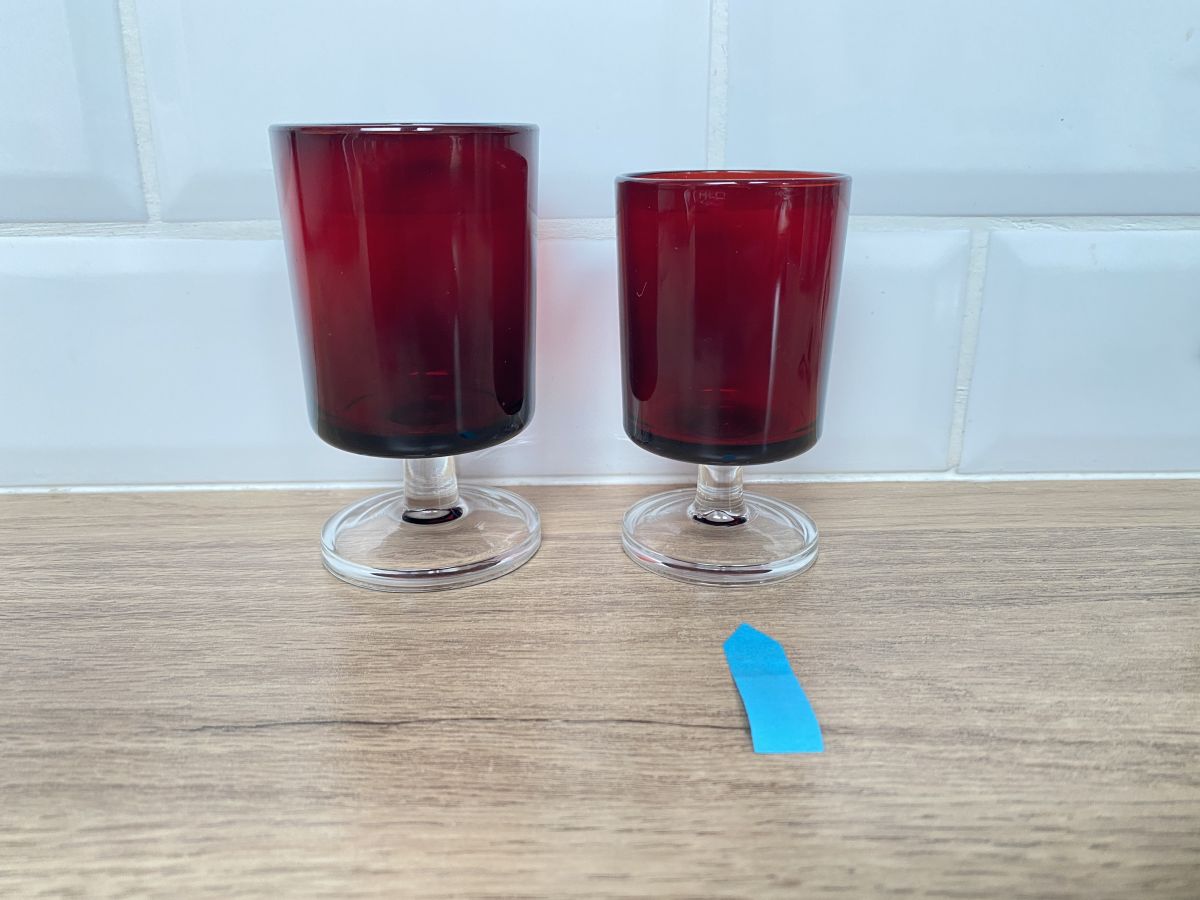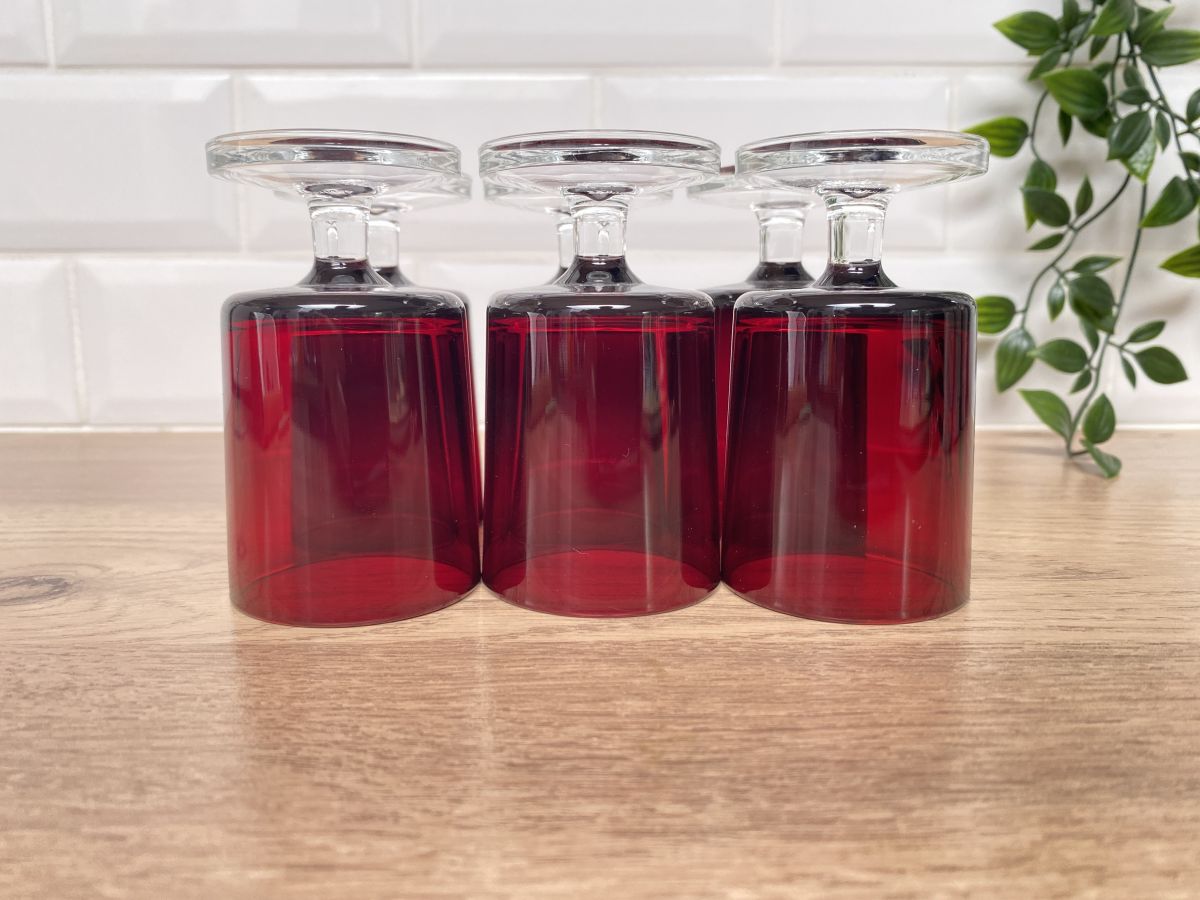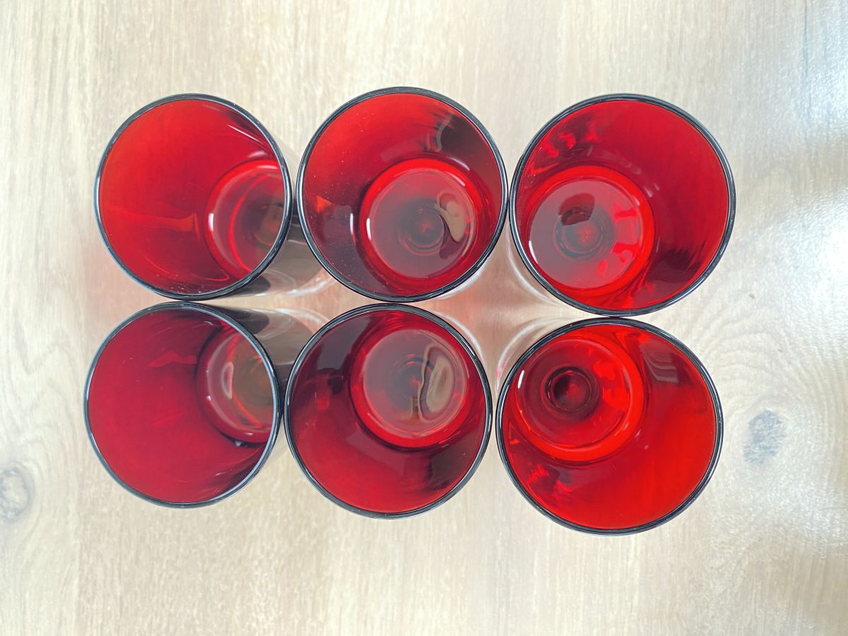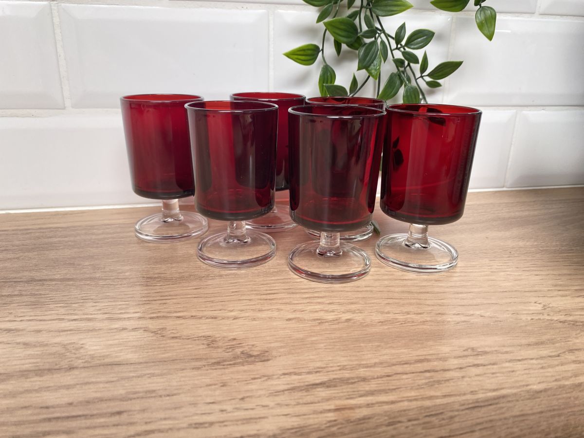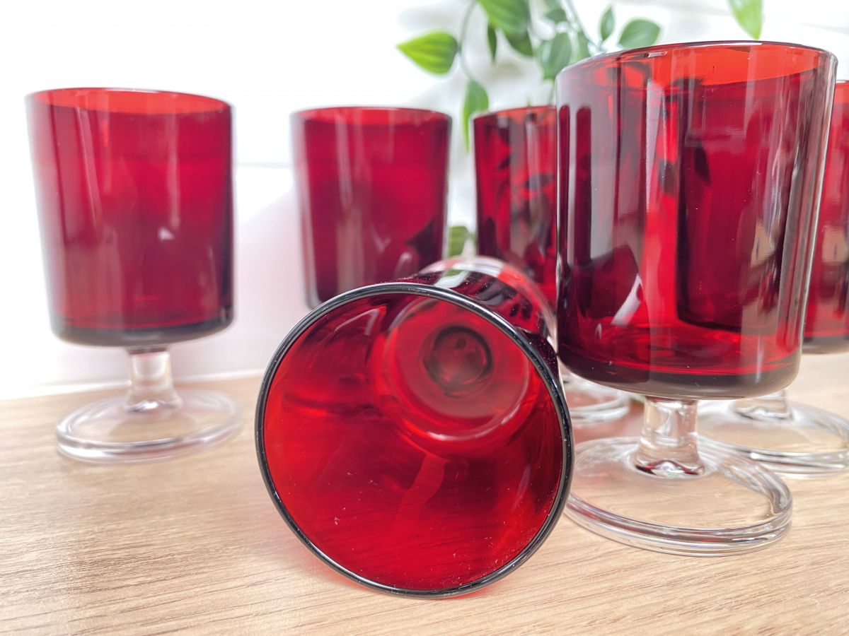Set de 6 verres Luminarc modèle Suède Rubis. Petits verres à vin à pied vintage en verre rouge et au pied transparent. Créés en france par durand/luminarc dans les années 70, début de fabrication en 1971. Bel état. Contenance 7 cl. Diamètre du buvant 5,2 cm, hauteur 9,2 cm. V997